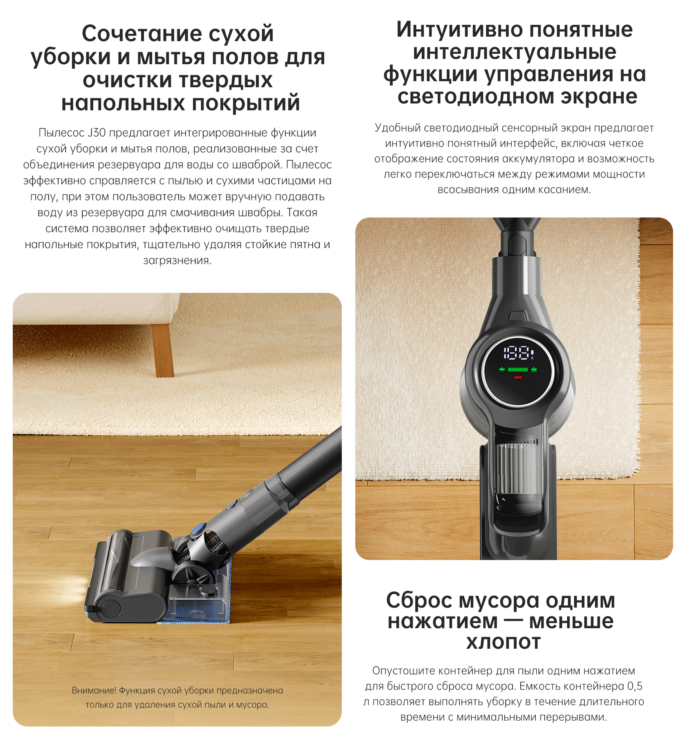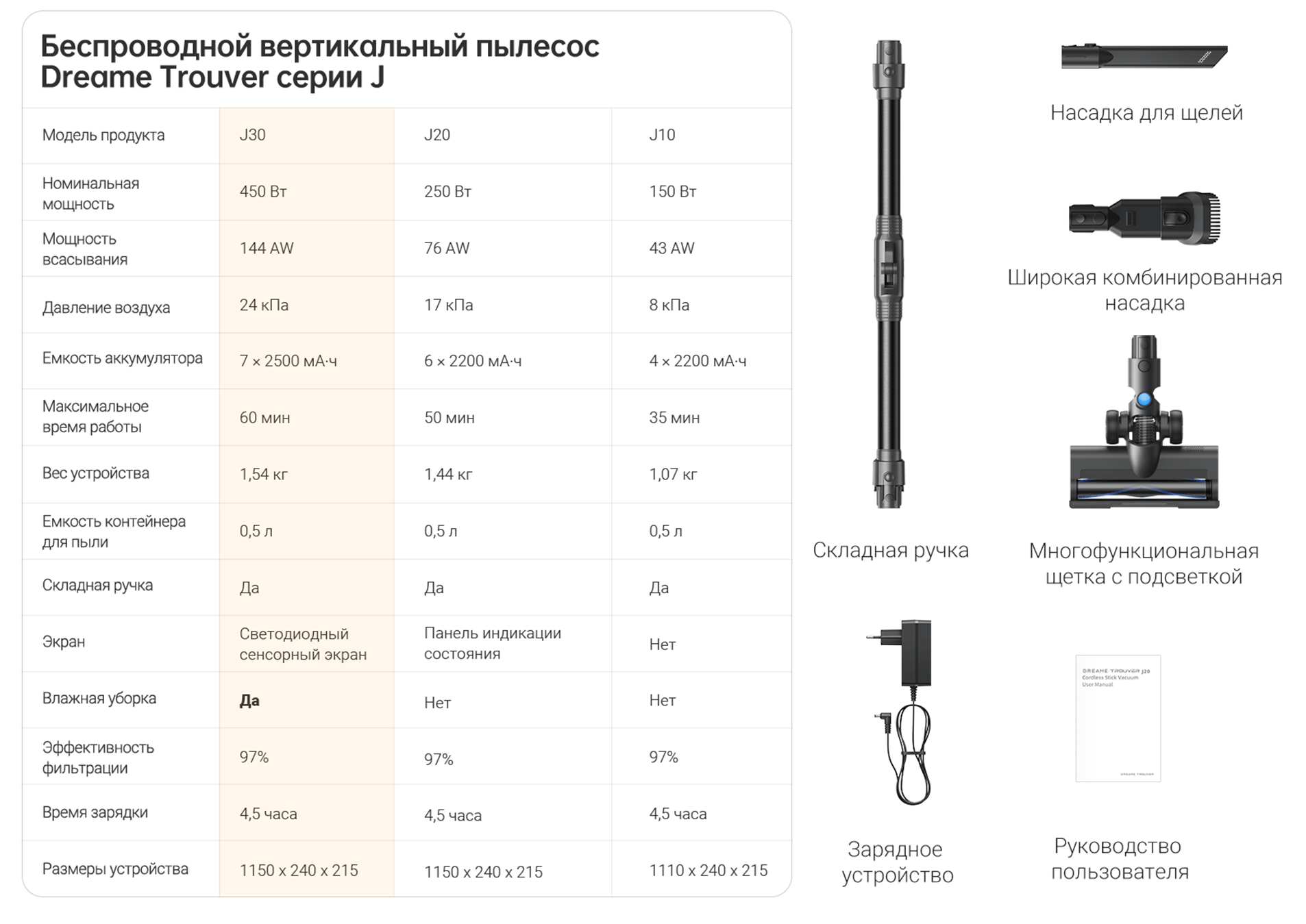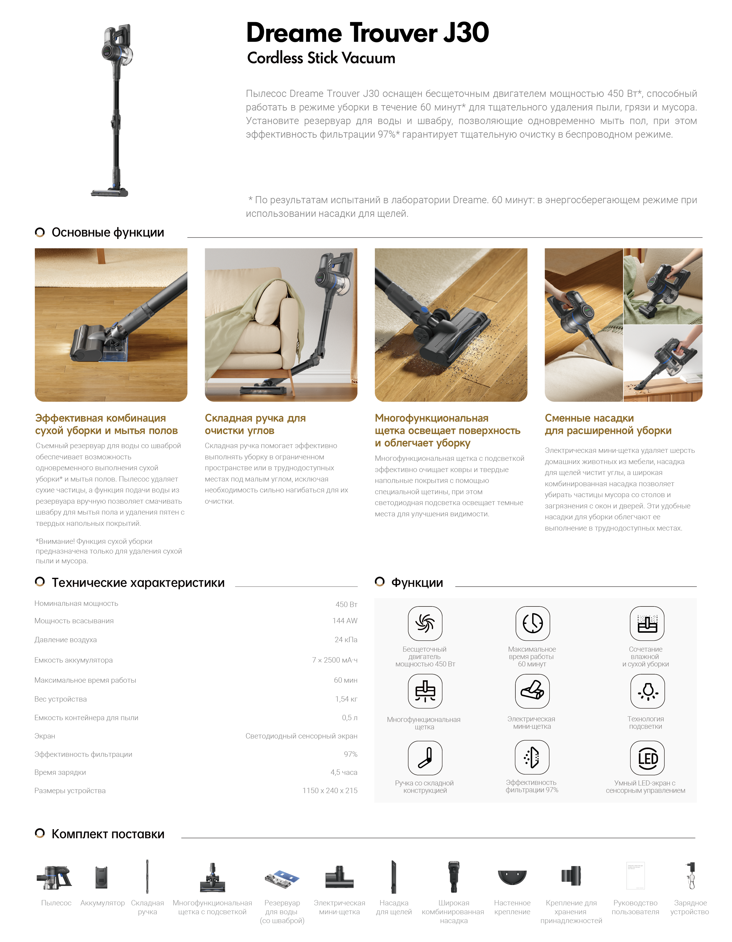 АртикулVJ12AМодельJ30ОписаниеЛёгкий беспроводной пылесос для сухой и влажной уборки. Время работы до 60 минут. Эффективность фильтрации 97%.ОсобенностиСкладная трубка для комфортной уборки под мебелью и в труднодоступных местах. Лёгкое опустошение пылесборника. Дополнительные насадки для различных поверхностей.Типручной пылесосВремя уборки максимальное60 минутГалереяИнструкциии и файлыОбщее количество насадок4КомплектацияОсновной корпус, удлинительная складная трубка, многофункциональная основная щётка, комбинированная насадка, щелевая насадка, мини-турбощётка, резервуар для воды, тканевая насадка, руководство пользователя.Мощность всасывания (Па)24000Уровень шума (дБ)81Мощность (Вт)450Объем пылесборника (л)0.5СерияJ - серияСистема фильтрацииHEPA-фильтрТип уборкивлажная / сухаяТип щеткиМногофункциональная щетка с подсветкой / Универсальная насадка 2-в-1 / Щелевая насадка / Электрическая мини-щеткаУборка ковровЕстьТип управлениякнопочноеЦветсерыйВлажный тип уборкидаСухой тип уборкидаМощность всасывания (Вт)150Работа с контейнером для пылидаНасадка для влажной уборки ковров/половдаФильтр HEPAдаИндикация включениядаТип электропитанияот аккумулятораТип аккумулятораLi-IonЕмкость аккумулятора (мAч)2500Напряжение аккумулятора (В)25.9Время заряда максимальное270 минутДополнительный цветсерыйКоличество предметов в упаковке10Подсветка зоны уборкидаРучной пылесос (handstick)даРегулировка мощностина корпусеТруба для всасыванияскладнаяМатериал трубы всасыванияметалл / пластикСъемный ручной пылесосдаНасадки в комплектещелевая насадка / щетка для влажной уборки / щеточная насадка 2 в 1 / электрическая мини-щеткаНасадка для мягкой мебелидаЩелевая насадкадаЛегко очищаемый пылесборникдаНастенное креплениедаLED-дисплейдаНасадка для пола и ковровдаТурбощеткa в комплектедаМесто для хранения насадокдаМатериал корпусапластикСпособ регулировки длинысмена насадокМинимальная цена со скидкой429Краткое наименованиеJ30Вес1.5 кгИзготовительMoonstone Technology (Shaoxing) Co., Ltd." Room 301, 3rd Floor, Building 2, No. 99 Chuangxing Road, Sunduan Street, Yuecheng District, Shaoxing City, Zhejiang Province, Китай.ИмпортерООО "АйТи Дистрибуция", 223053, Республика Беларусь, Минская область, Минский район, Боровлянский с/с, 103/3-7, помещение №7-50Срок гарантии12 мес.