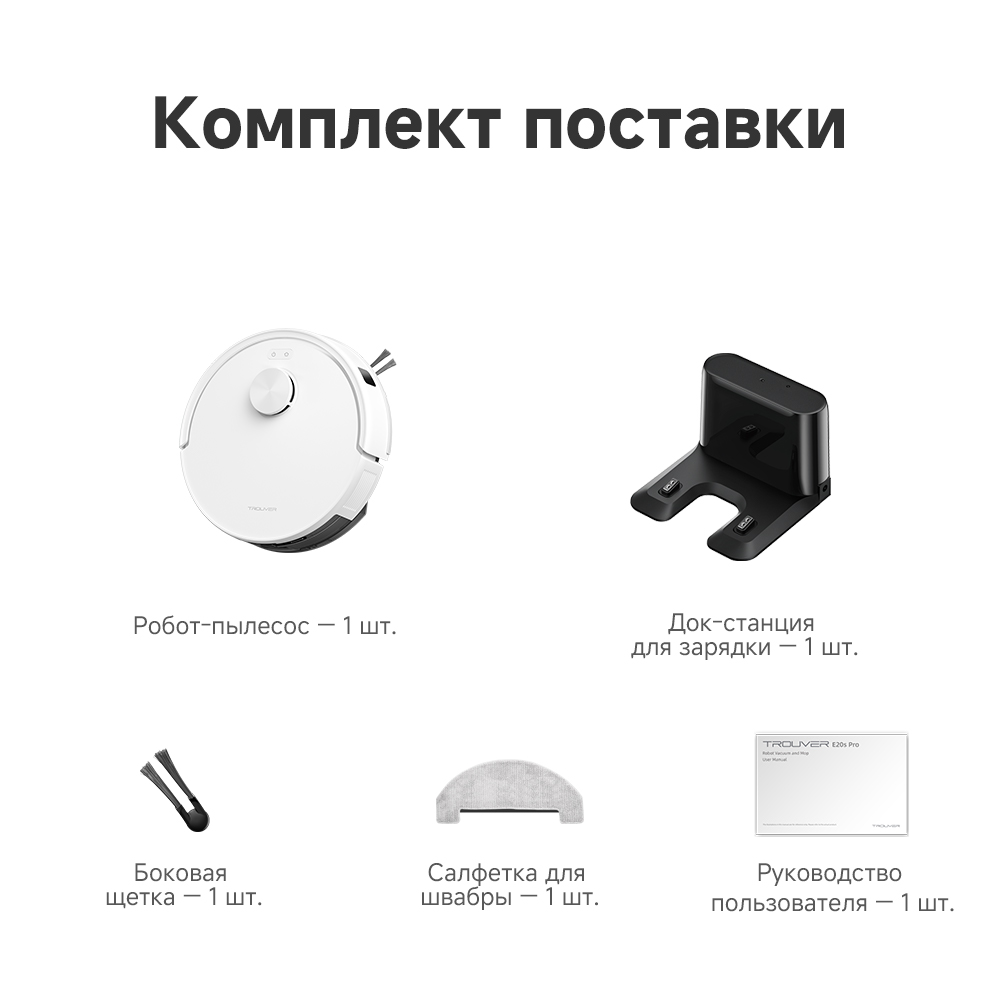 АртикулRLE24SAМодельE20s Pro WhiteОписаниеМоющий робот-пылесос TROUVER E20s Pro с мощностью всасывания 13 000 Па и системой объезда препятствий 3DAdapt прекрасно справляется с повседневной уборкой, делая уборку полов проще простого.ОсобенностиУсовершенствованная защита от наматывания волос и шерсти: U-образная боковая щетка, направляющий гребень с воздушным обдувом, V-образная основная щетка. Решение 2 в 1 для сухой уборки и мытья пола. Ультразвуковой датчик распознавания ковров и автоматическое увеличение мощности всасывания.Типробот-пылесосНазначениедля полаМобильное приложениеTrouverГалереяКомплектацияРобот-пылесос, зарядная станция, боковая щетка, салфетка для влажной уборки, руководство пользователя.Мощность всасывания (Па)13000Датчик обнаружения препятствийдаБак для чистой воды (л)0.245Объем пылесборника (л)0.33Станция самоочисткинетСерияE - серияСистема фильтрацииHEPA-фильтрСоставление плана помещенияЕстьТаймер включениядаТип щеткиТурбощеткаУборка ковровЕстьТип управлениякнопочное / со смартфона / через приложениеУправление со смартфонадаЦветбелыйВлажный тип уборкидаСухой тип уборкидаНавигационная системалидарПостроение карты помещениядаПрорезиненные колесадаАвтоматический поиск зарядного устройствадаЗарядка робота-пылесосадок-станцияБоковые щеткидаУборка по расписаниюдаФильтр HEPAдаДатчик перепада высотыдаИндикация включениядаАвтоматическая работадаТип аккумулятораLi-IonЕмкость аккумулятора (мAч)3200Количество предметов в упаковке6Легко очищаемый пылесборникдаЗвуковой сигналдаИндикатор включениядаМатериал корпусапластикМинимальная цена со скидкой529Краткое наименованиеE20s ProРазмеры320 x 320 x 96 ммВес2.8 кгИзготовительMoonstone Technology (Shaoxing) Co., Ltd." Room 301, 3rd Floor, Building 2, No. 99 Chuangxing Road, Sunduan Street, Yuecheng District, Shaoxing City, Zhejiang Province, Китай.ИмпортерООО "АйТи Дистрибуция", 223053, Республика Беларусь, Минская область, Минский район, Боровлянский с/с, 103/3-7, помещение №7-50Срок гарантии12 мес.