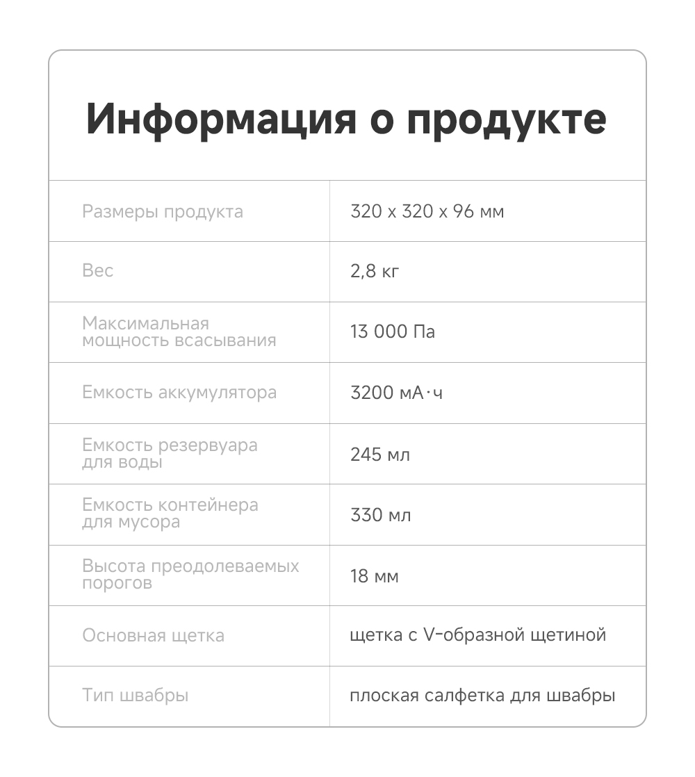 Типробот-пылесосНазначениедля полаКоличество предметов в упаковке6Влажный тип уборкидаСухой тип уборкидаМощность всасывания (Па)13000Объем пылесборника (л)0.33Бак для чистой воды (л)0.245Навигационная системалидарСтанция самоочисткинетПостроение карты помещениядаПрорезиненные колесадаАвтоматический поиск зарядного устройствадаЗарядка робота-пылесосадок-станция