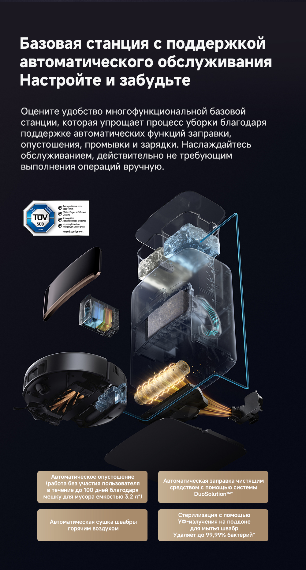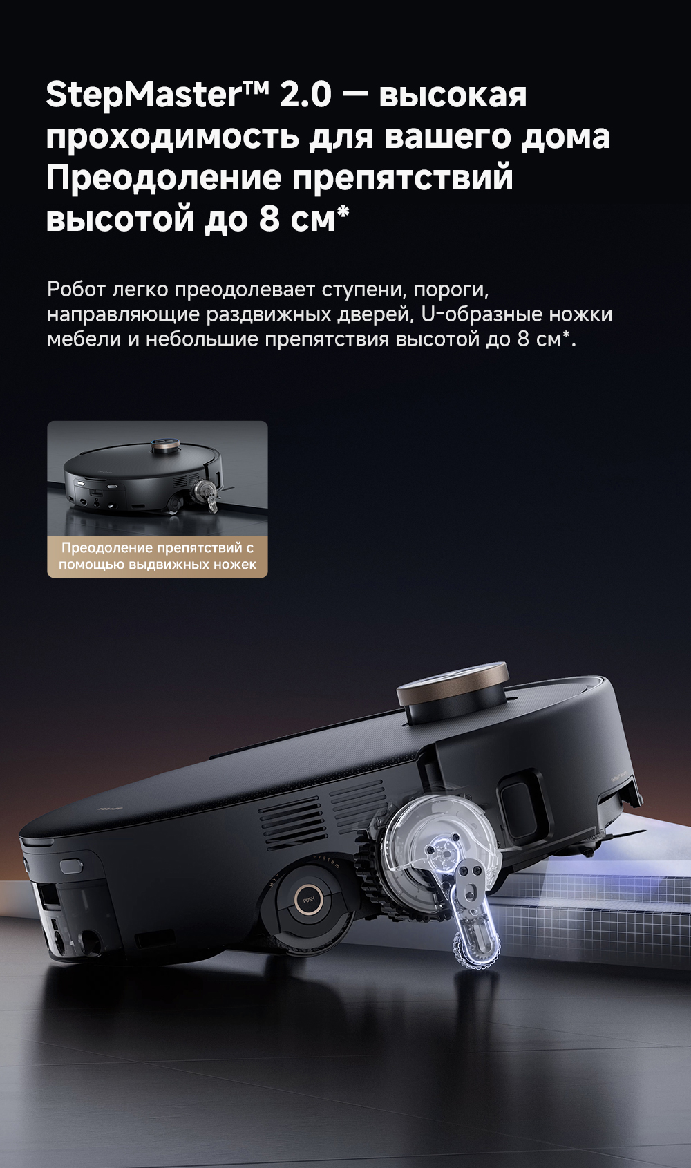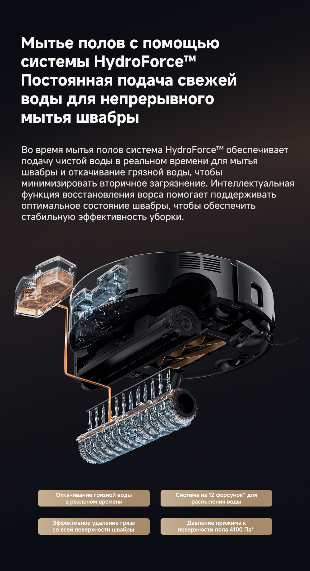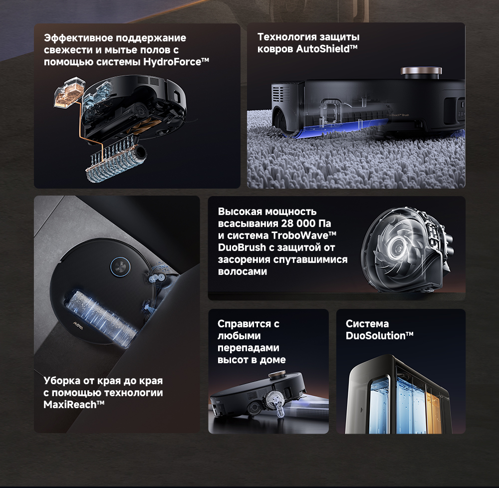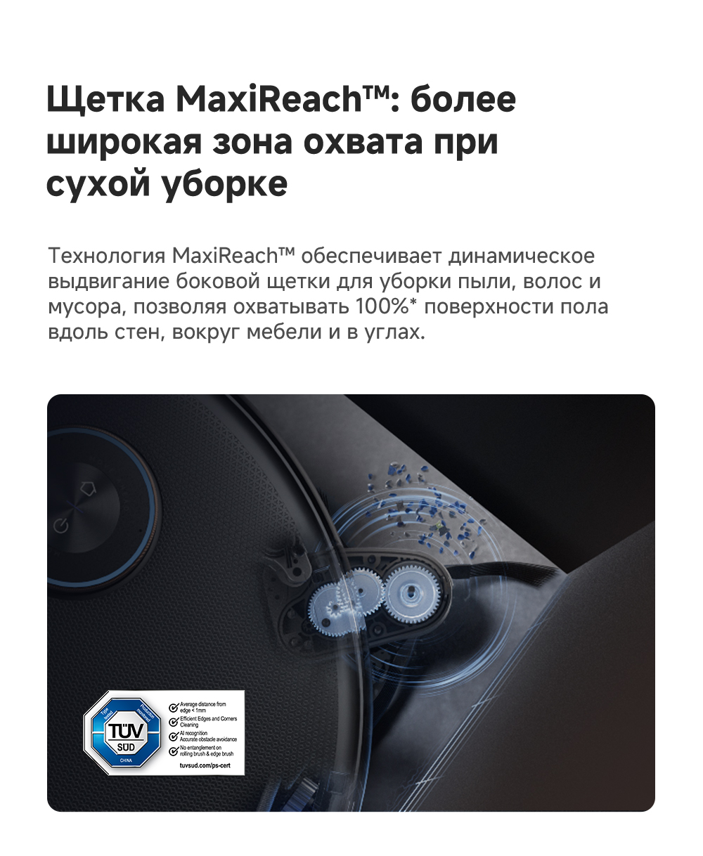 ОписаниеМощная и тщательная очистка, умный обход препятствий, комплексная уборка.ОсобенностиМытьё полов HydroForce - система распыления с 12 форсунками, мощное удаление грязи на 360°. Система StepMaster 2.0 - преодоление двойных порогов высотой до 8 см (4.5 + 3.5 см), преодоление одиночных порогов высотой до 4.8 см. Автоматическая очистка сухого мусора, заправка моющим средством, очистка швабры горячей водой и сушка горячим воздухом. Двойная щётка TroboWave с защитой от запутывания волос. Распознавание более 200 типов препятствий с помощью ИИ.