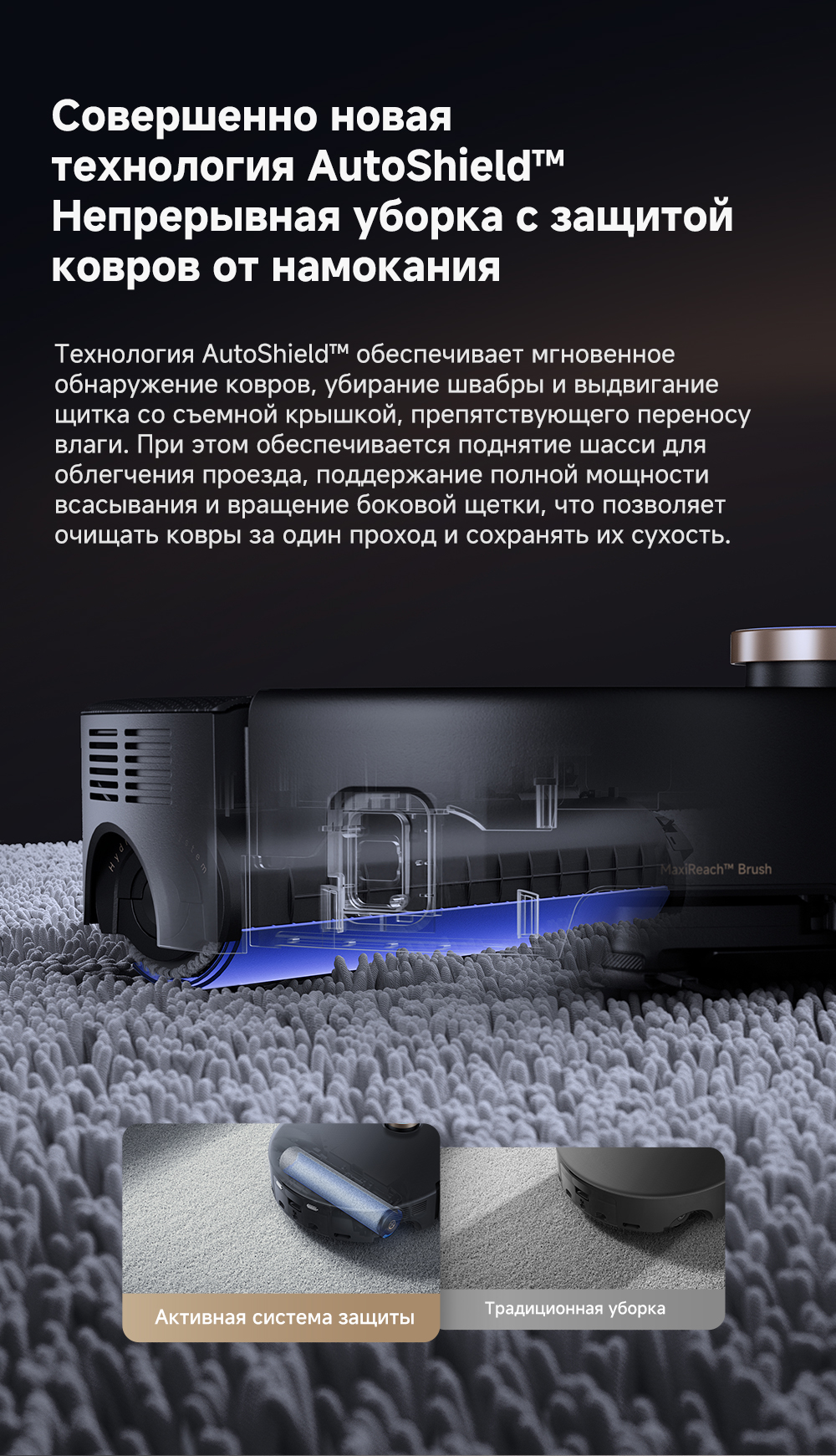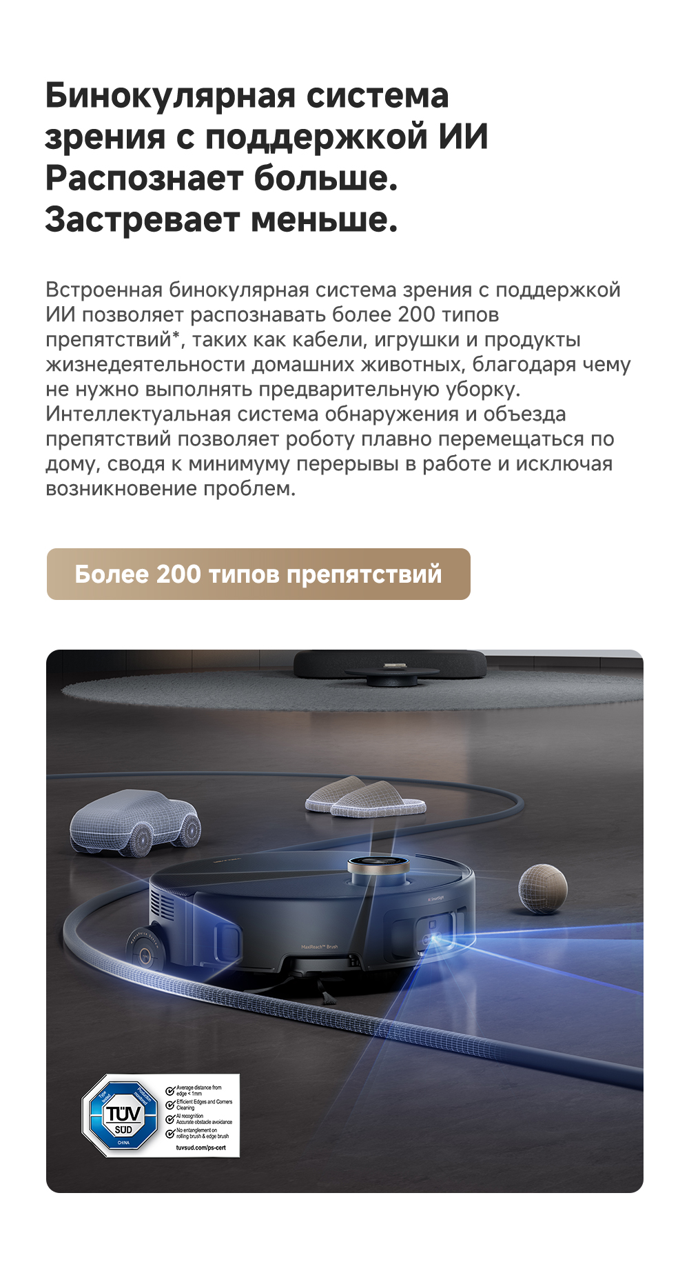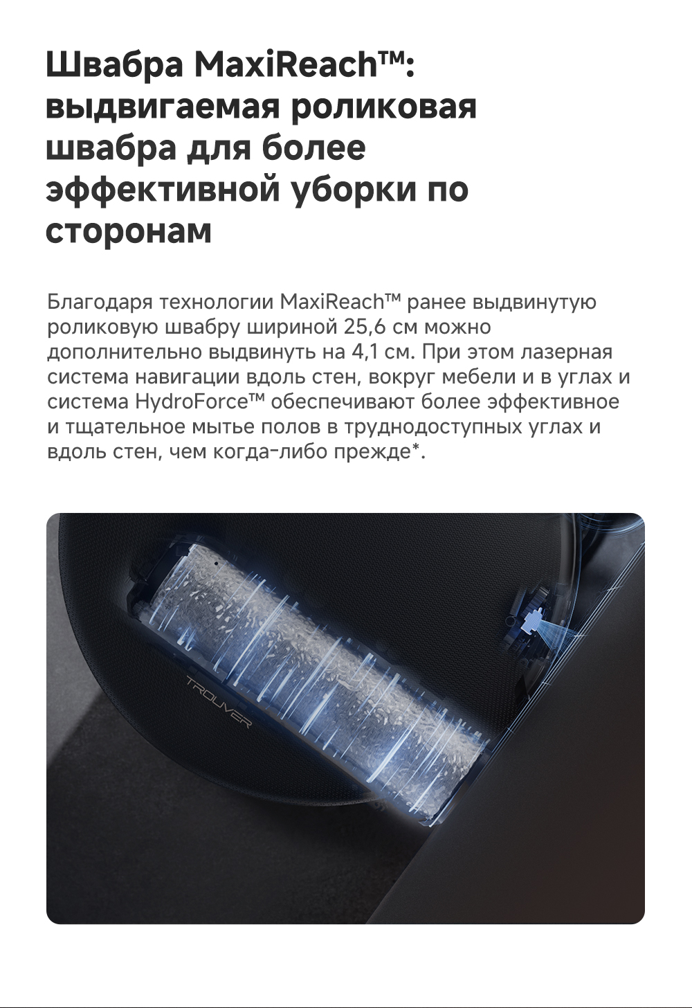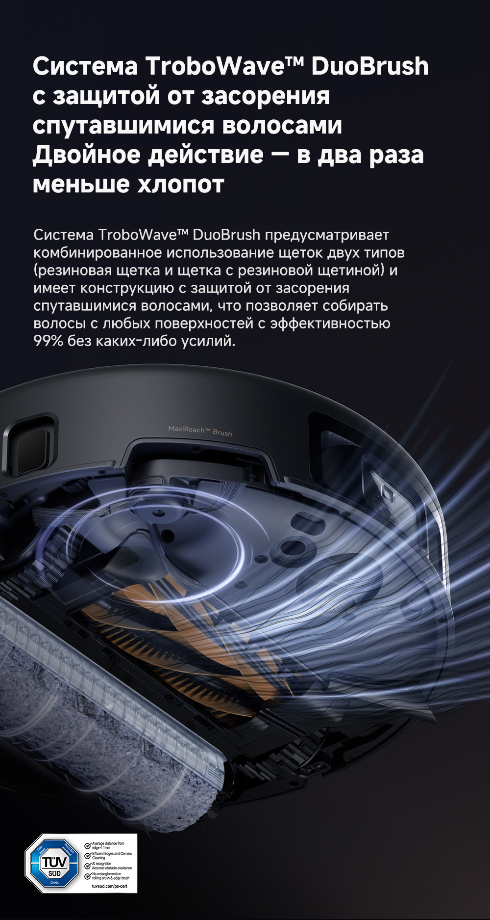 ОписаниеМощная и тщательная очистка, умный обход препятствий, комплексная уборка.ОсобенностиМытьё полов HydroForce - система распыления с 12 форсунками, мощное удаление грязи на 360°. Система StepMaster 2.0 - преодоление двойных порогов высотой до 8 см (4.5 + 3.5 см), преодоление одиночных порогов высотой до 4.8 см. Автоматическая очистка сухого мусора, заправка моющим средством, очистка швабры горячей водой и сушка горячим воздухом. Двойная щётка TroboWave с защитой от запутывания волос. Распознавание более 200 типов препятствий с помощью ИИ.