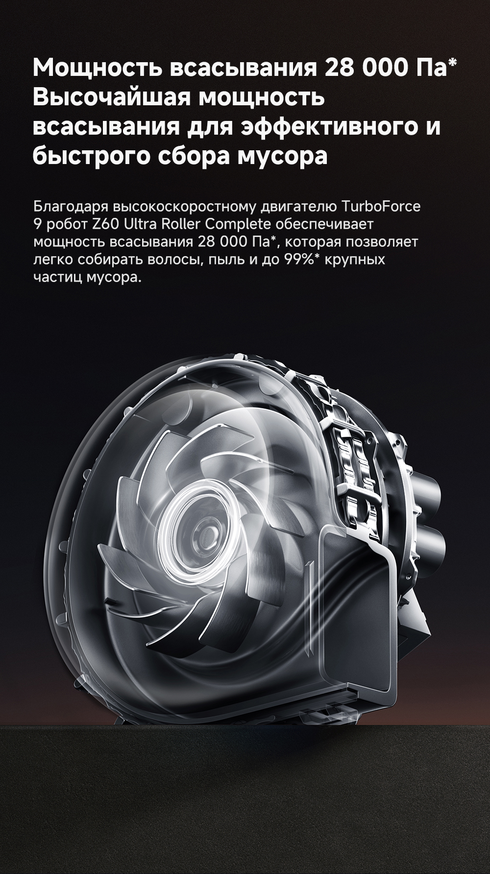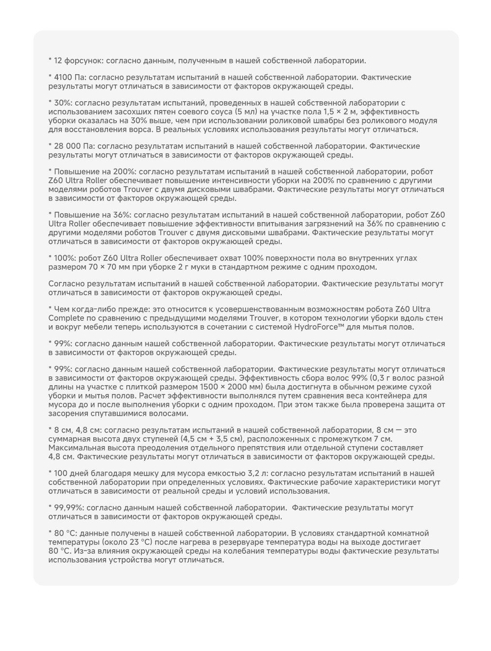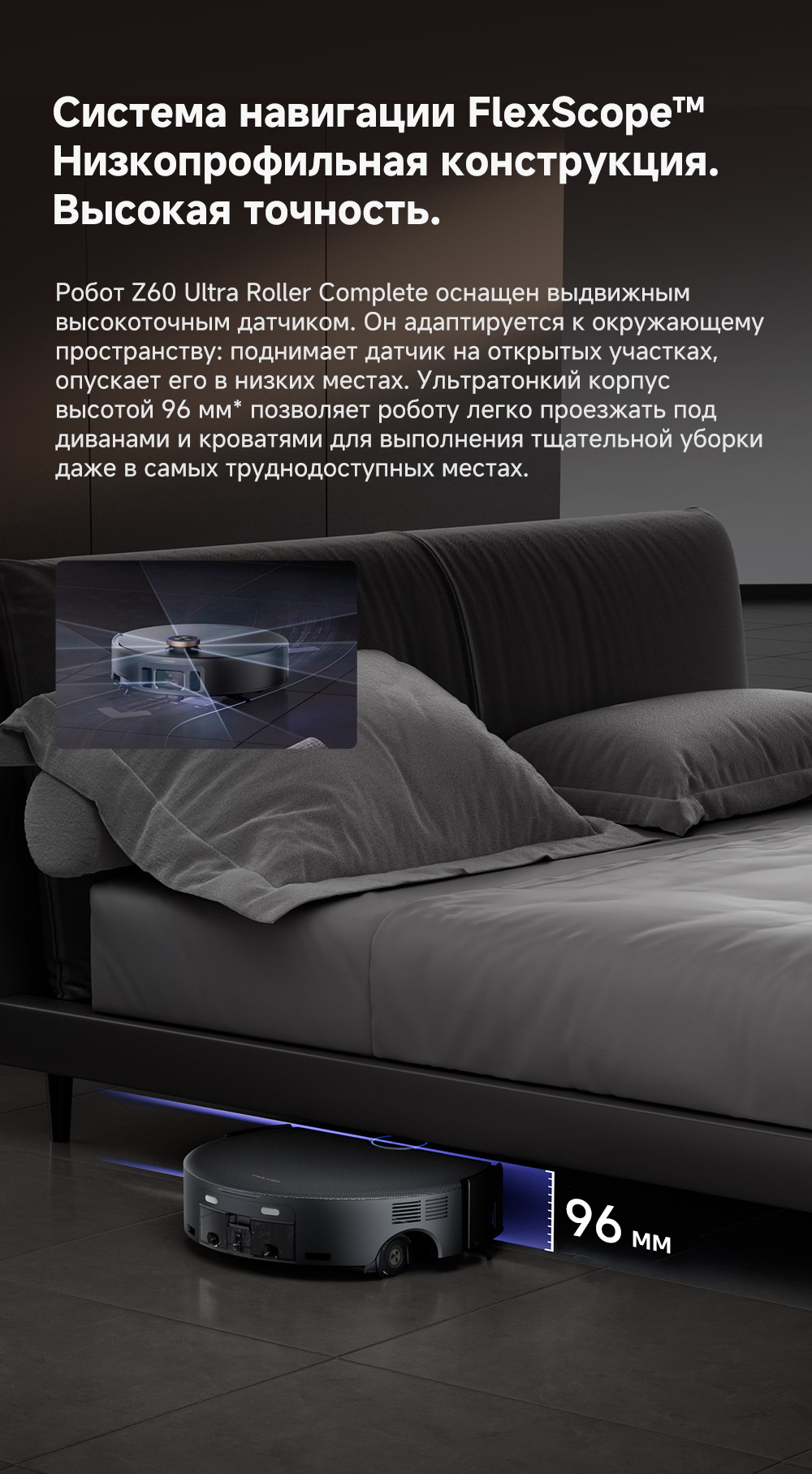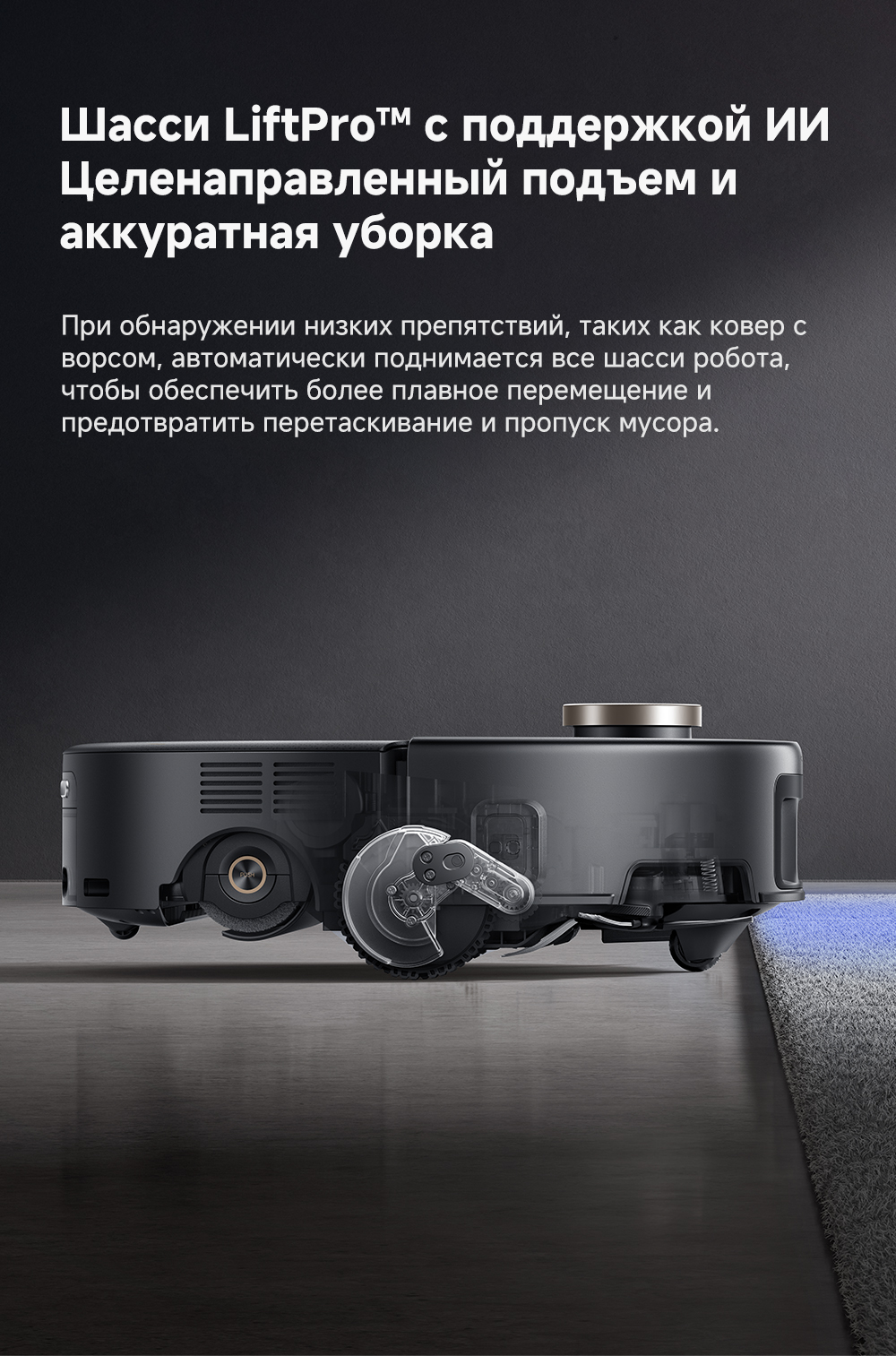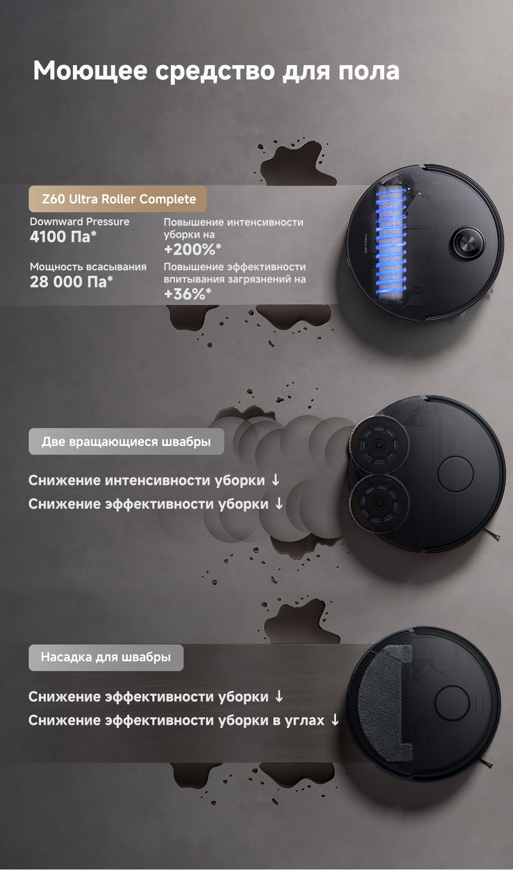 ОписаниеМощная и тщательная очистка, умный обход препятствий, комплексная уборка.ОсобенностиМытьё полов HydroForce - система распыления с 12 форсунками, мощное удаление грязи на 360°. Система StepMaster 2.0 - преодоление двойных порогов высотой до 8 см (4.5 + 3.5 см), преодоление одиночных порогов высотой до 4.8 см. Автоматическая очистка сухого мусора, заправка моющим средством, очистка швабры горячей водой и сушка горячим воздухом. Двойная щётка TroboWave с защитой от запутывания волос. Распознавание более 200 типов препятствий с помощью ИИ.