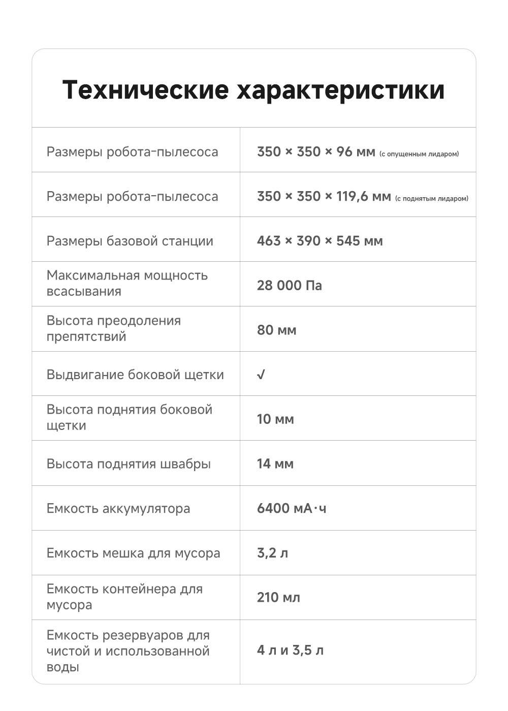 Типробот-пылесосНазначениедля полаТип уборкивлажная, сухаяВлажный тип уборкидаСухой тип уборкидаМощность всасывания (Па)28000Объем пылесборника (л)0.21Бак для чистой воды (л)4Навигационная системаVersaLift (опускающийся LiDar): LDS AI + 3DСтанция самоочисткидаПостроение карты помещениядаБак для использованной воды (л)3.5Прорезиненные колесадаАвтоматический поиск зарядного устройствадаЗарядка робота-пылесосадок-станция