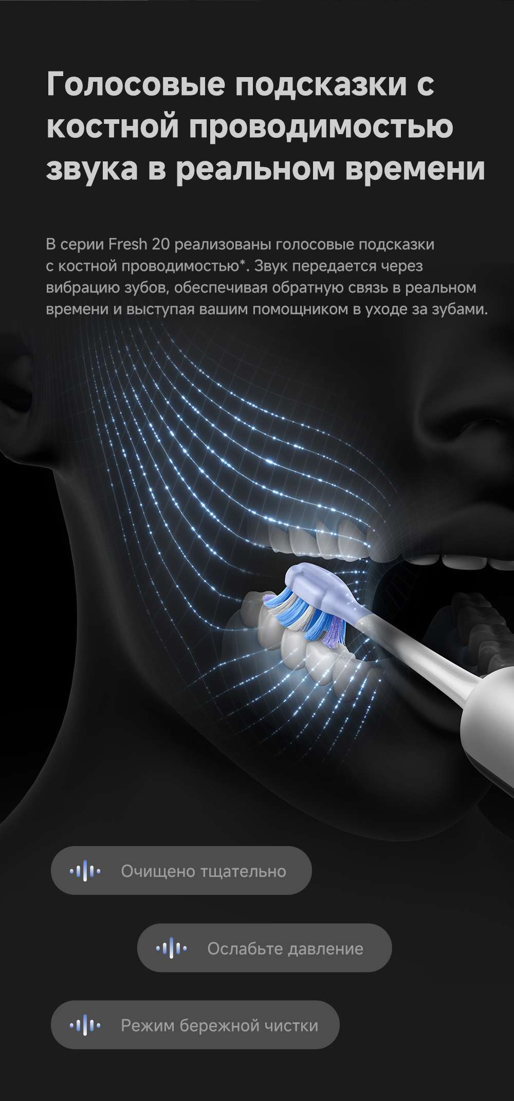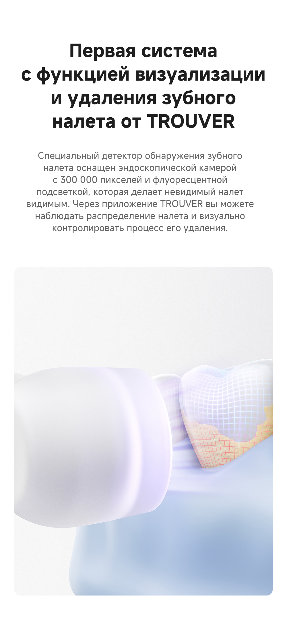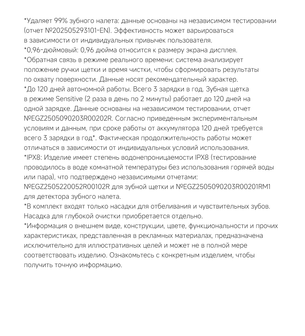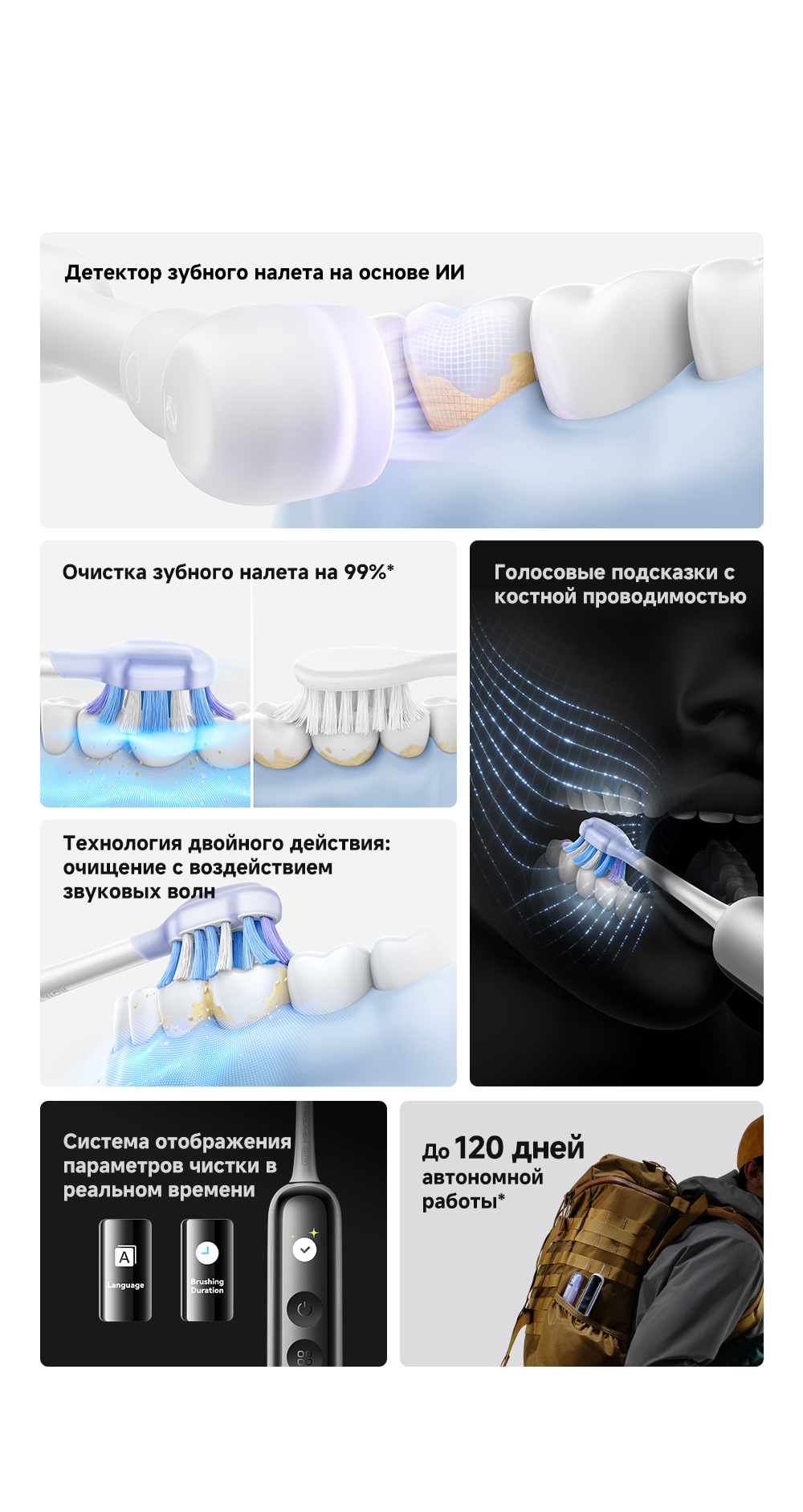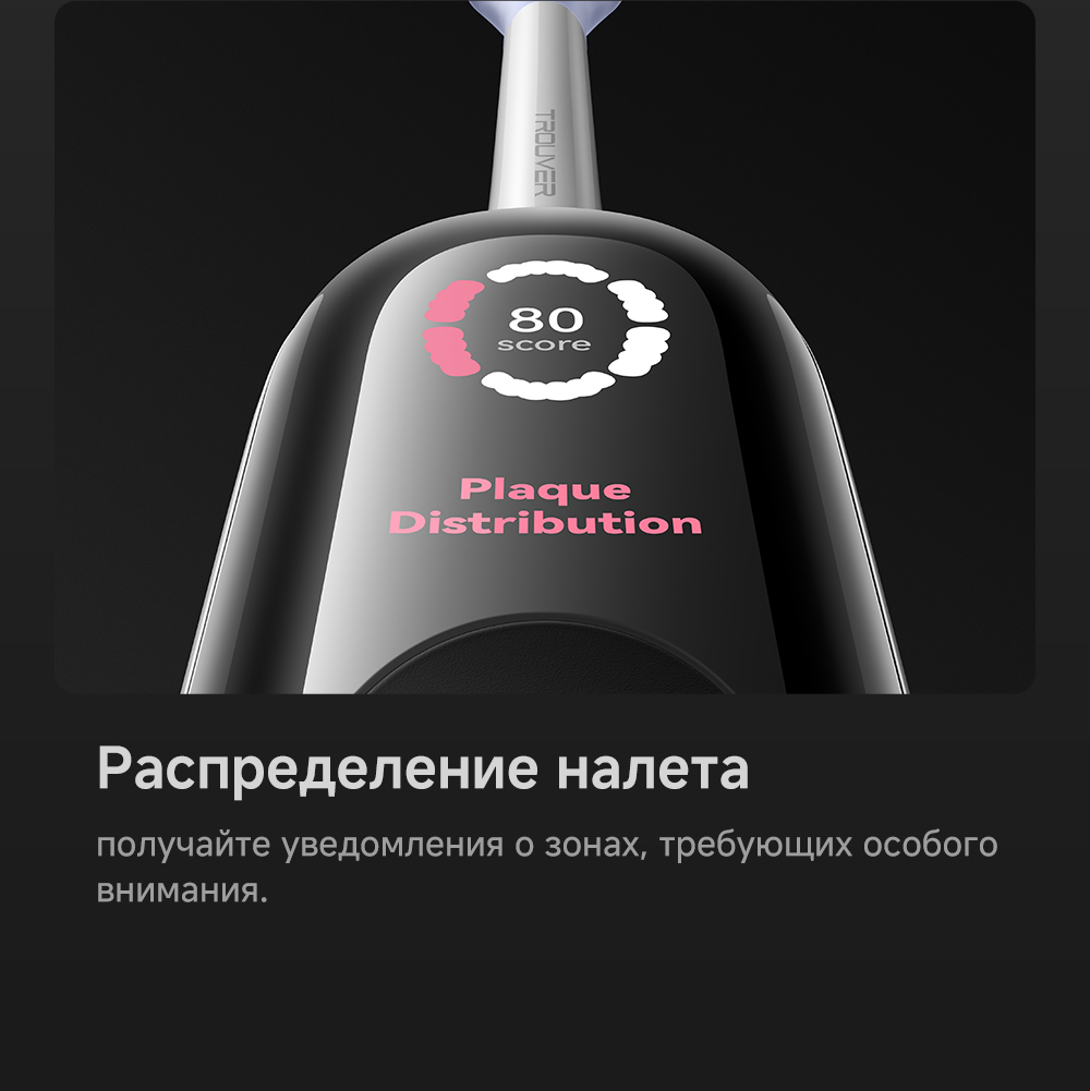 Детектор зубного налета на основе ИИ: оснащён эндоскопической камерой с 300 000 пикселей, которая обеспечивает сверхчёткое изображение. Технология распознавания изображений на основе ИИ обеспечивает точное детектирование зубного налета. Зубная щётка автоматически переходит в интеллектуальный режим и в зависимости от распределения зубного налёта усиливает вибрацию в зонах его наибольшего распространения. Интеллектуальные уведомления о чистке: голосовые подсказки, касающиеся режимов чистки и её завершённости, активный мониторинг интенсивности нажима.
