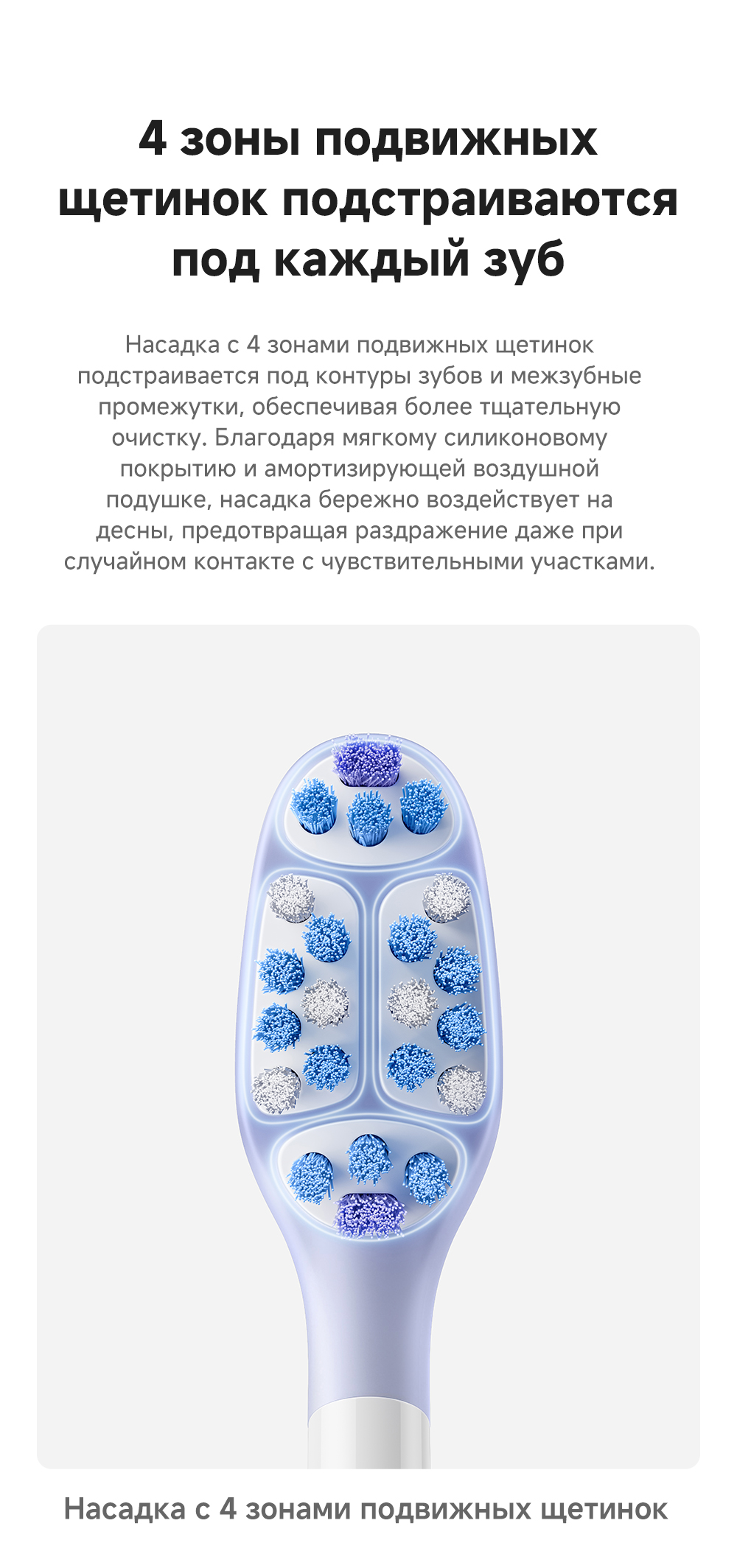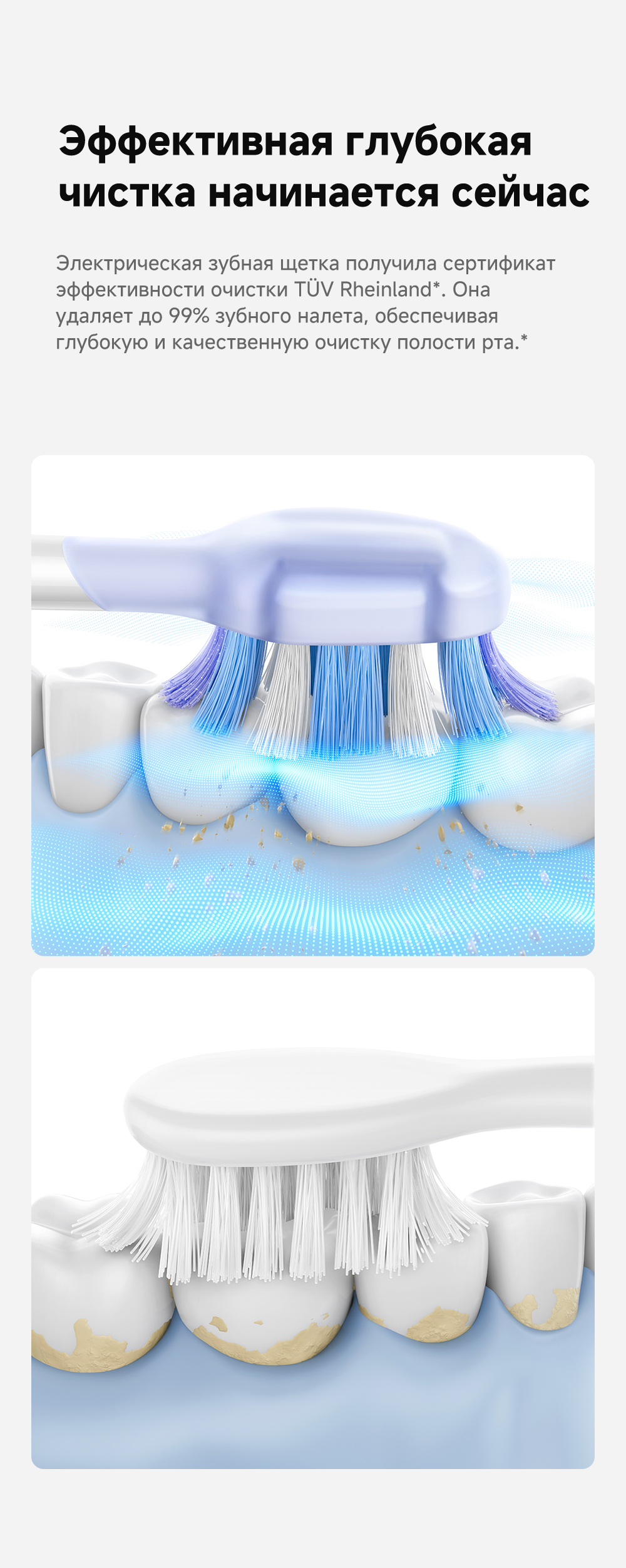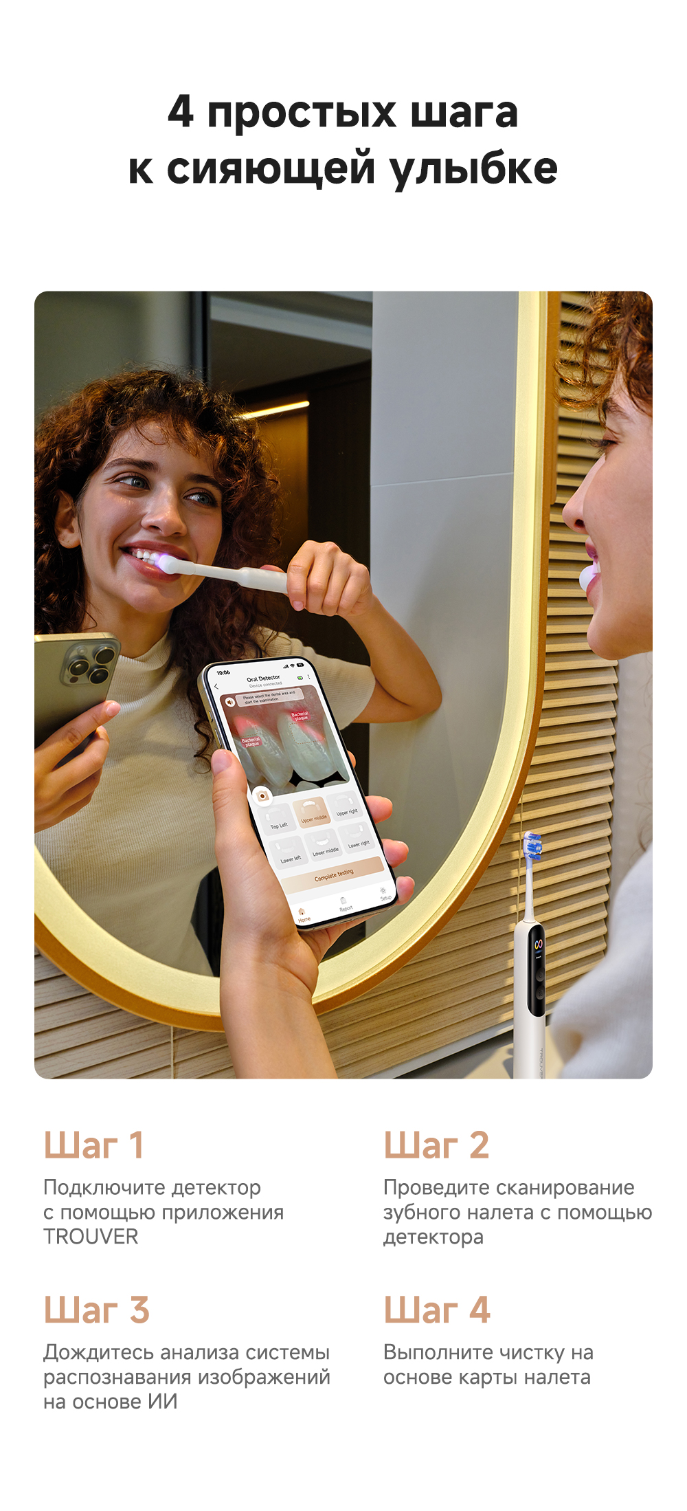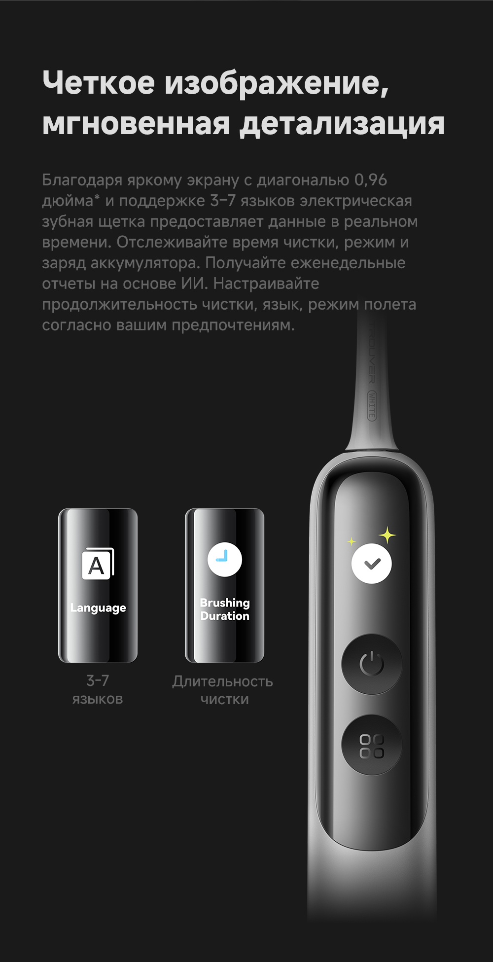 Детектор зубного налета на основе ИИ: оснащён эндоскопической камерой с 300 000 пикселей, которая обеспечивает сверхчёткое изображение. Технология распознавания изображений на основе ИИ обеспечивает точное детектирование зубного налета. Зубная щётка автоматически переходит в интеллектуальный режим и в зависимости от распределения зубного налёта усиливает вибрацию в зонах его наибольшего распространения. Интеллектуальные уведомления о чистке: голосовые подсказки, касающиеся режимов чистки и её завершённости, активный мониторинг интенсивности нажима.