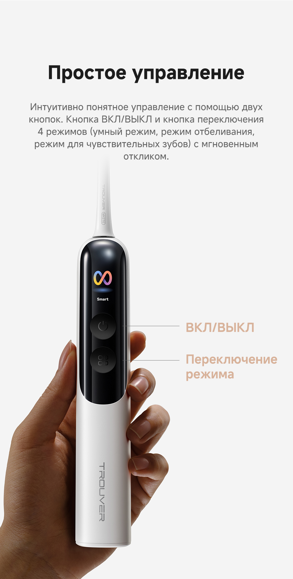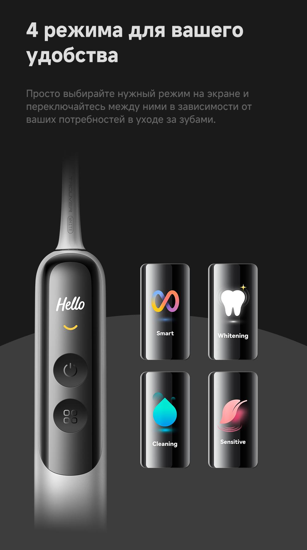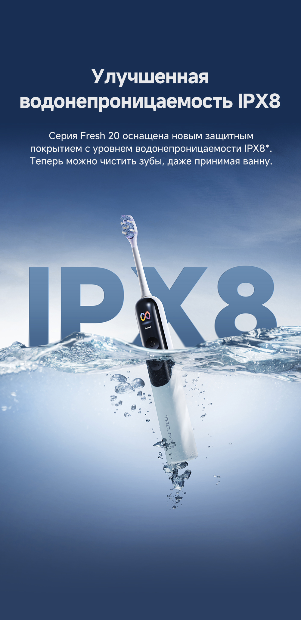 Система двойной чистки: очищение + обработка ультразвуком. Система визуализации зубного налета. Новый подход к безопасности личной гигиены: защита от влаги IPX8, 120 дней автономной работы. 4 режима (10 настраиваемых уровней интенсивности).