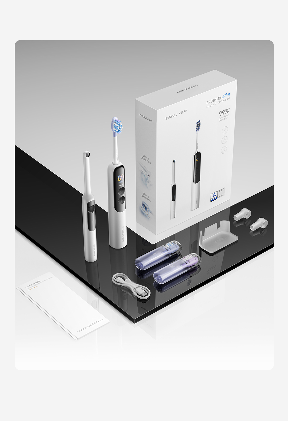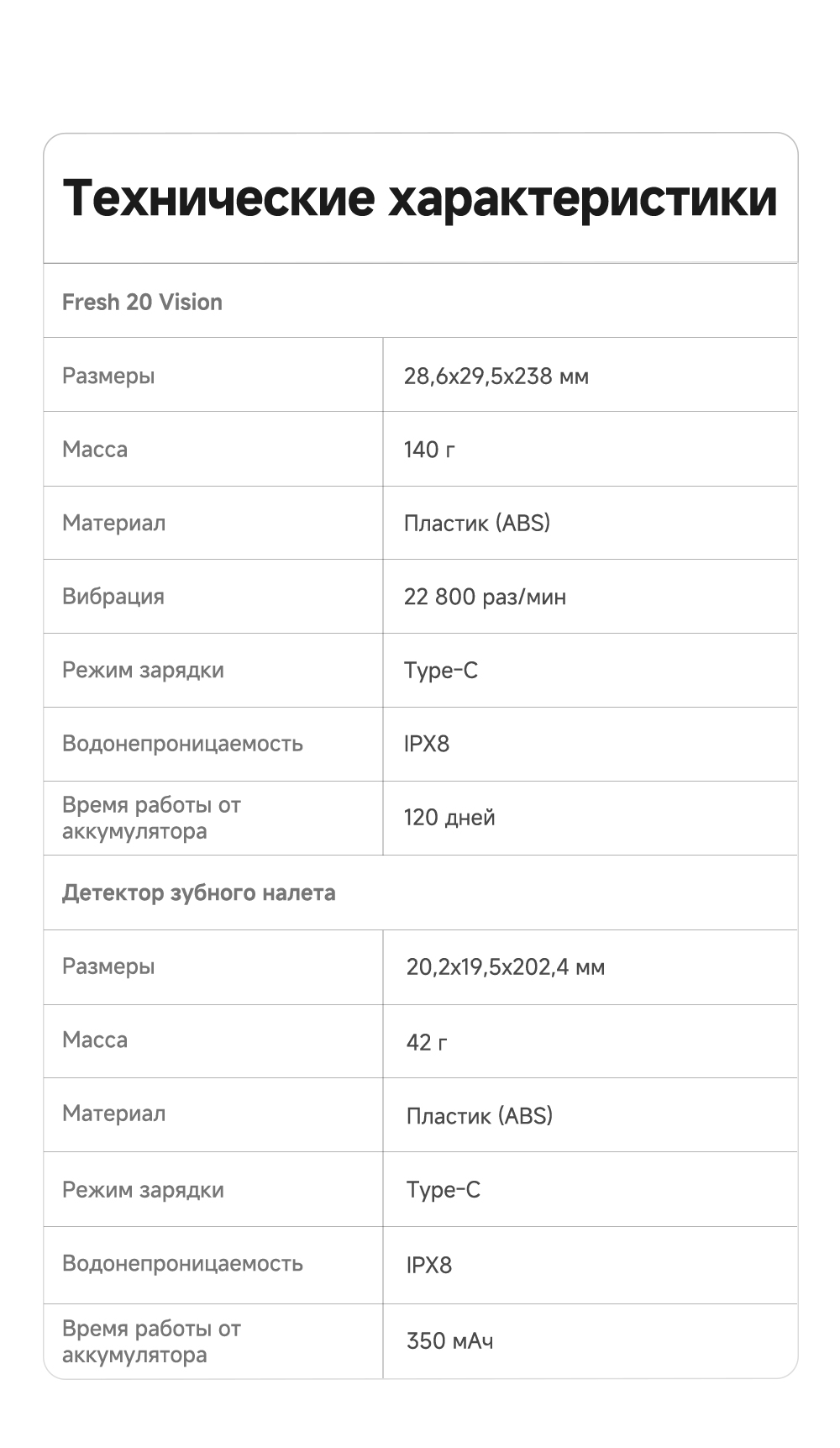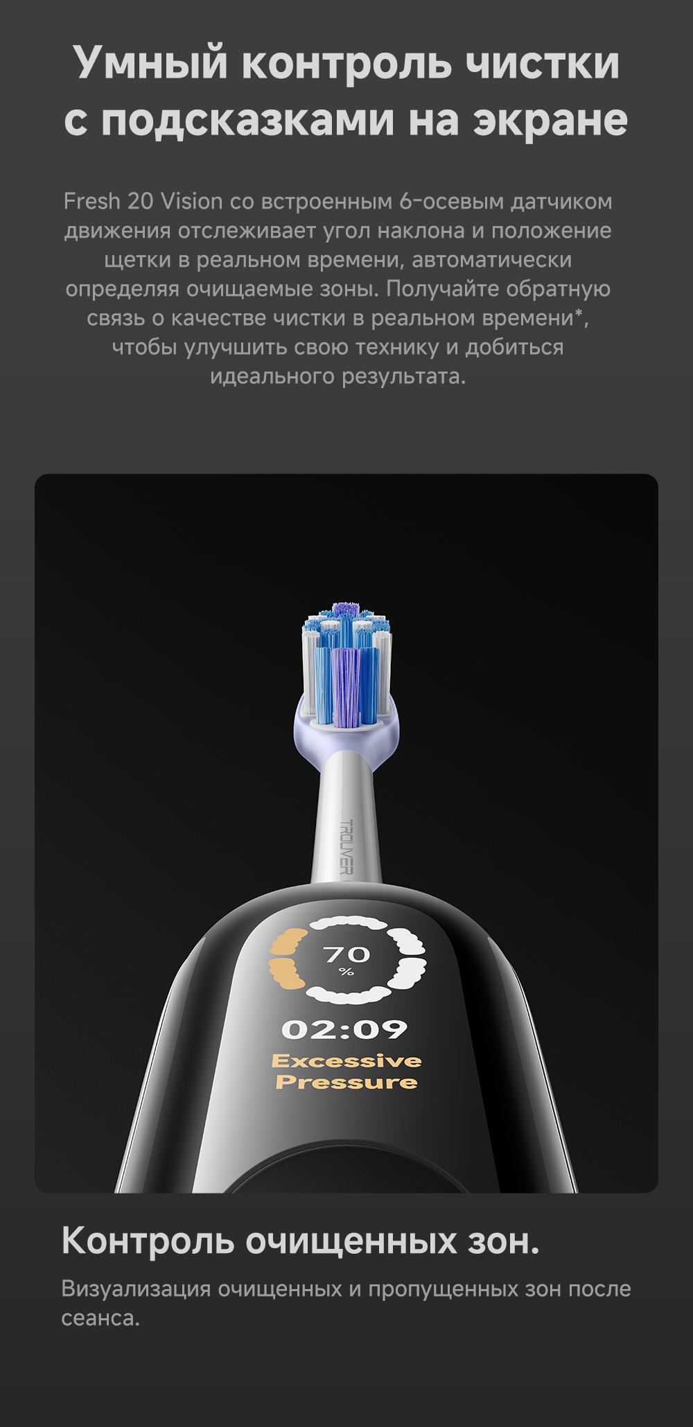 АртикулFresh 20 VisionМодельFresh 20 Vision BlackОписаниеСистема двойной чистки: очищение + обработка ультразвуком. Система визуализации зубного налета. Новый подход к безопасности личной гигиены: защита от влаги IPX8, 120 дней автономной работы. 4 режима (10 настраиваемых уровней интенсивности).ОсобенностиДетектор зубного налета на основе ИИ: оснащён эндоскопической камерой с 300 000 пикселей, которая обеспечивает сверхчёткое изображение. Технология распознавания изображений на основе ИИ обеспечивает точное детектирование зубного налета. Зубная щётка автоматически переходит в интеллектуальный режим и в зависимости от распределения зубного налёта усиливает вибрацию в зонах его наибольшего распространения. Интеллектуальные уведомления о чистке: голосовые подсказки, касающиеся режимов чистки и её завершённости, активный мониторинг интенсивности нажима.Типзубная щёткаСвязанные элементы по цветуМобильное приложениеTrouverГалереяГолосовой помощникЕстьКомплектацияРучка электрической зубной щётки, насадка - 2 шт., кабель для зарядки, держатель зубной щётки, устройство для обнаружения зубного налёта, крышка камеры - 2 шт., руководство пользователя.СерияFresh - серияТип управлениякнопочноеЦветчерныйИндикация включениядаТип электропитанияот аккумулятораКоличество предметов в упаковке8Индикация степени зарядкидаИндикация режима работыдаРегулировка мощностина корпусеLED-дисплейдаКоличество программ/режимов4Информационный дисплейдаЗвуковой сигналдаИндикатор включениядаМатериал корпусапластикМинимальная цена со скидкой279Краткое наименованиеTrouver Fresh 20 Vision BlackРазмеры28.6 х 29.5 х 238 ммВес140 гИзготовитель"Moonstone Technology (Shaoxing) Co., Ltd." Room 301, 3rd Floor, Building 2, No. 99 Chuangxing Road, Sunduan Street, Yuecheng District, Shaoxing City, Zhejiang Province, Китай.ИмпортерООО "АйТи Дистрибуция", 223053, Республика Беларусь, Минская область, Минский район, Боровлянский с/с, 103/3-7, помещение №7-50Срок гарантии36 мес.