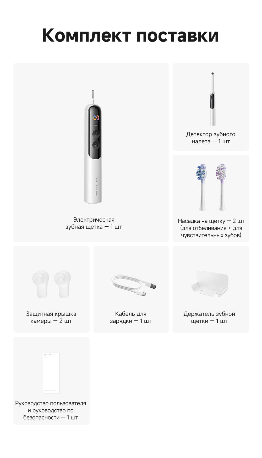 Ручка электрической зубной щётки, насадка - 2 шт., кабель для зарядки, держатель зубной щётки, устройство для обнаружения зубного налёта, крышка камеры - 2 шт., руководство пользователя.