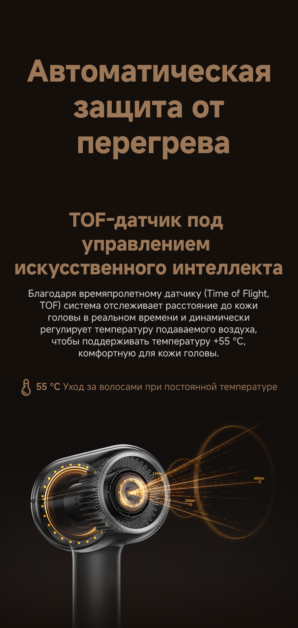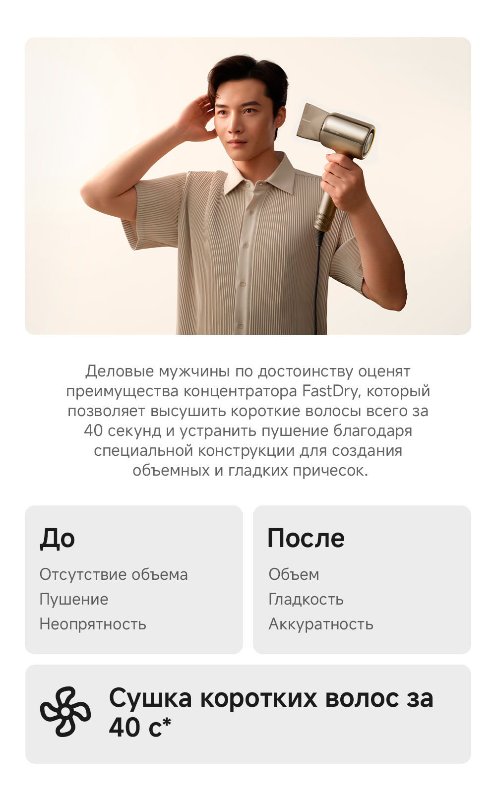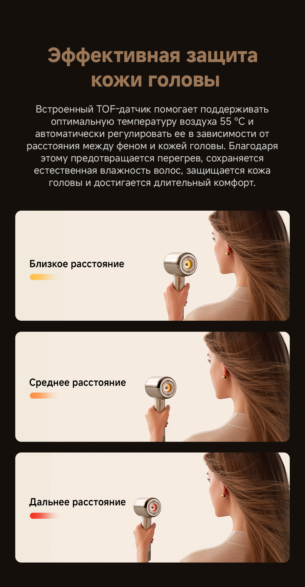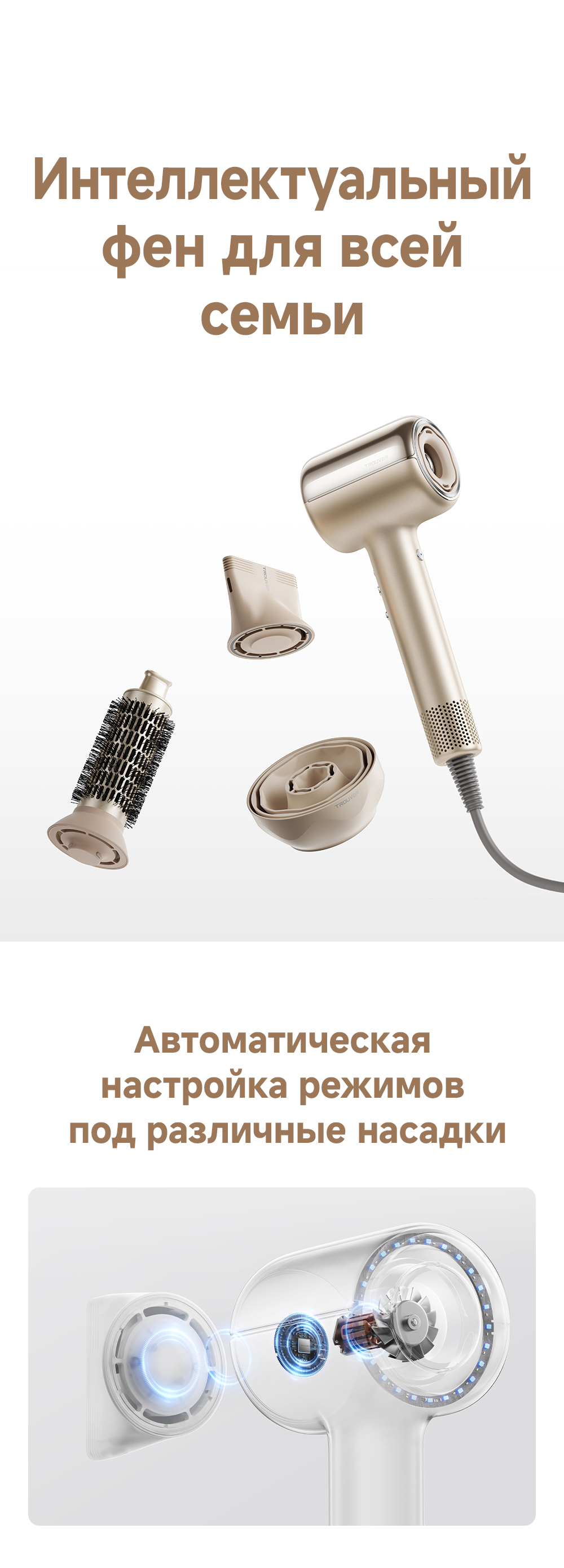 Датчик TOF отслеживает температуру кожи головы в режиме реального времени, предотвращая перегрев. Интеллектуально распознаёт различные насадки и автоматически подстраивается под различные режимы. Детская насадка с большой площадью обдува для мягкого воздушного потока, фрактальной траекторией потока для снижения шума и динамичной циркуляцией воздуха 40-50°C. Насадка-концентратор FastDry сушит короткие волосы всего за 40 секунд благодаря мощному потоку воздуха. Расческа для придания объёма волосам с лёгкостью превращает гладкие, вьющиеся волосы в упругие, блестящие, готовые к укладке.