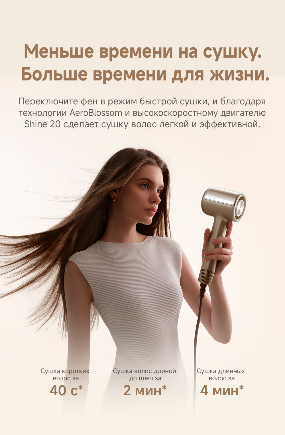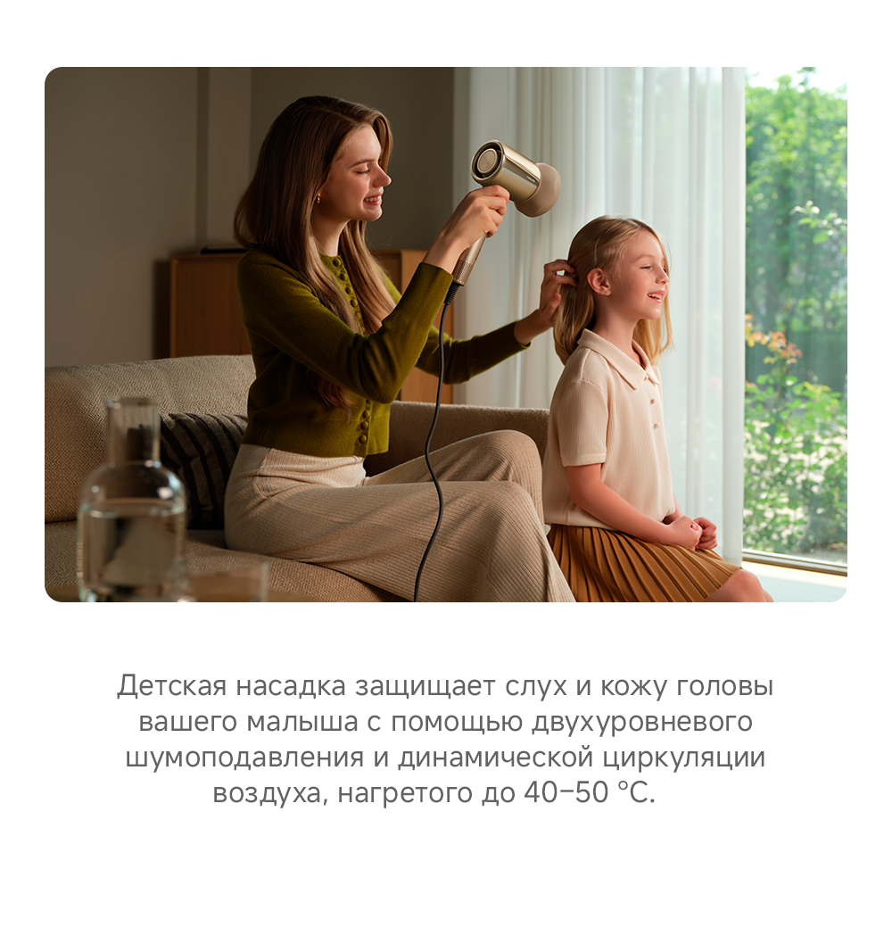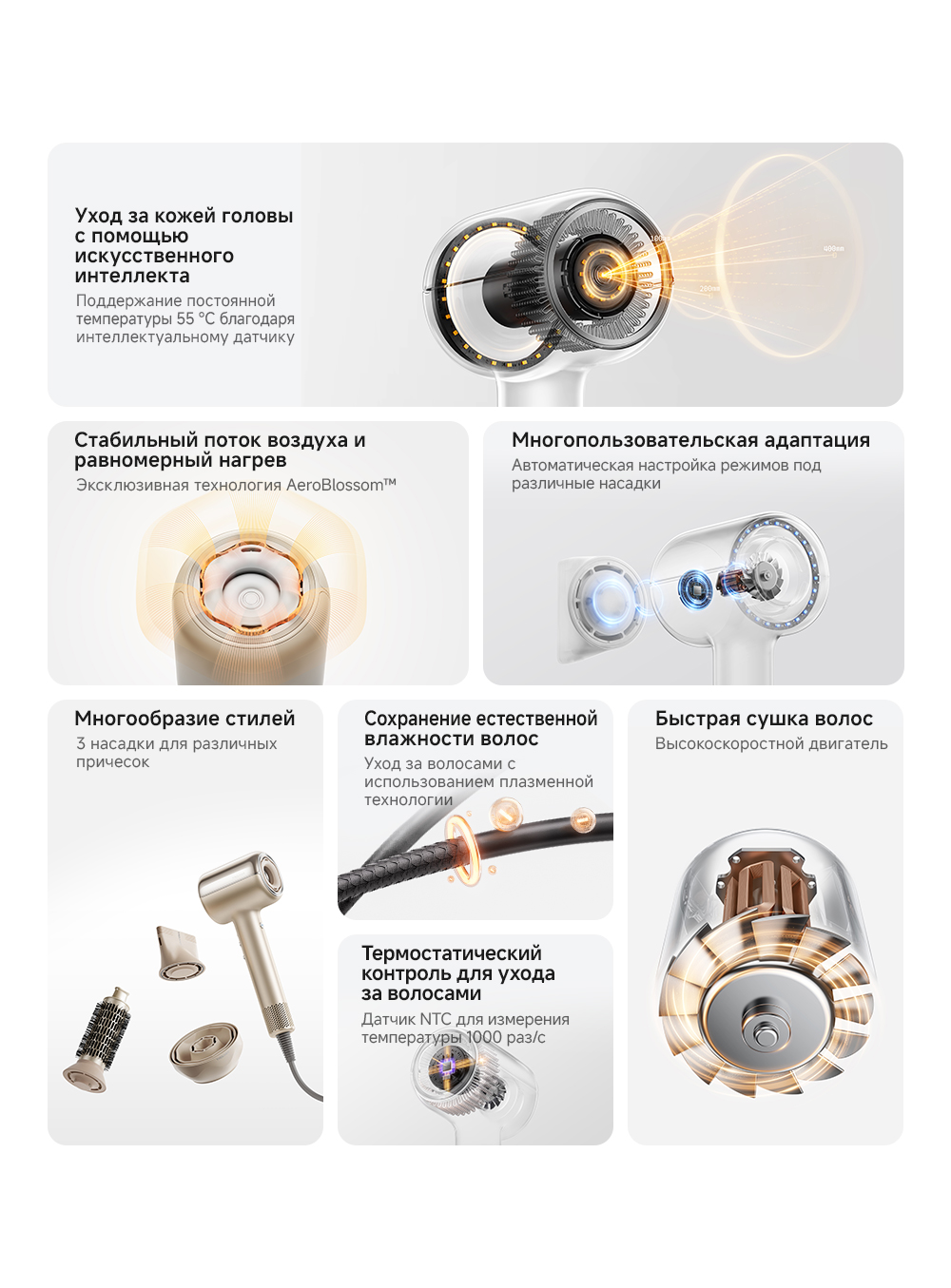 Датчик TOF отслеживает температуру кожи головы в режиме реального времени, предотвращая перегрев. Интеллектуально распознаёт различные насадки и автоматически подстраивается под различные режимы. Детская насадка с большой площадью обдува для мягкого воздушного потока, фрактальной траекторией потока для снижения шума и динамичной циркуляцией воздуха 40-50°C. Насадка-концентратор FastDry сушит короткие волосы всего за 40 секунд благодаря мощному потоку воздуха. Расческа для придания объёма волосам с лёгкостью превращает гладкие, вьющиеся волосы в упругие, блестящие, готовые к укладке.