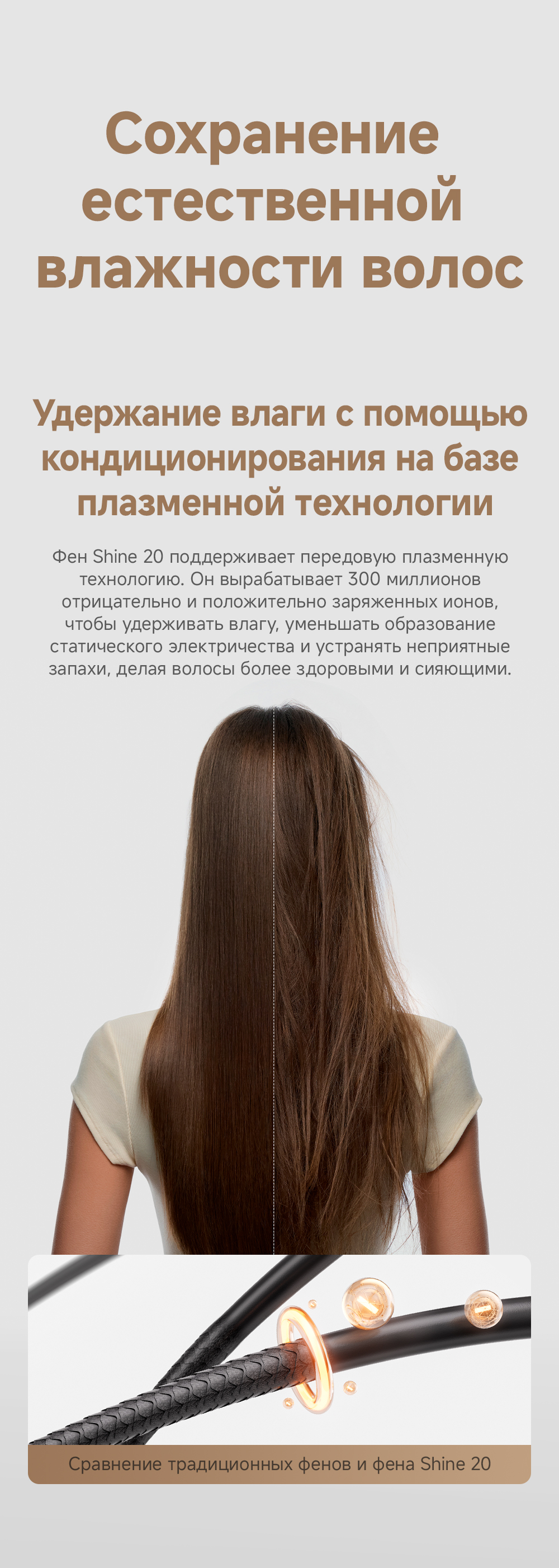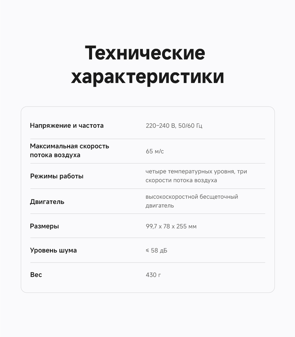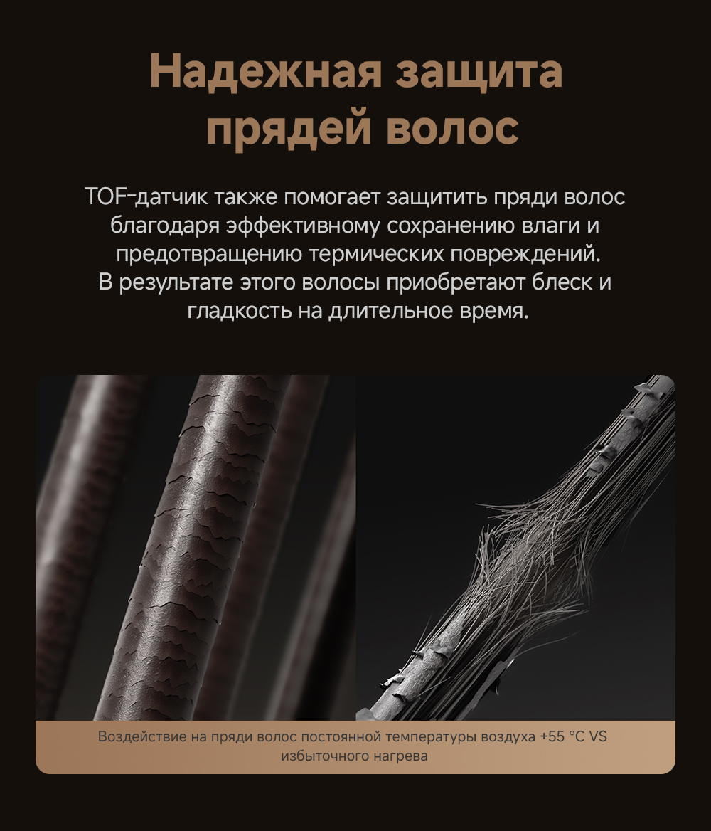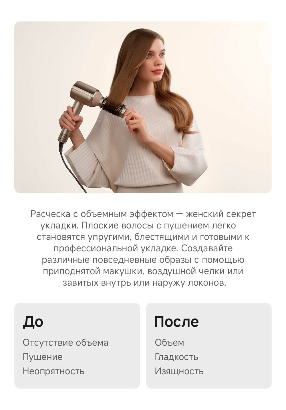 Датчик TOF отслеживает температуру кожи головы в режиме реального времени, предотвращая перегрев. Интеллектуально распознаёт различные насадки и автоматически подстраивается под различные режимы. Детская насадка с большой площадью обдува для мягкого воздушного потока, фрактальной траекторией потока для снижения шума и динамичной циркуляцией воздуха 40-50°C. Насадка-концентратор FastDry сушит короткие волосы всего за 40 секунд благодаря мощному потоку воздуха. Расческа для придания объёма волосам с лёгкостью превращает гладкие, вьющиеся волосы в упругие, блестящие, готовые к укладке.