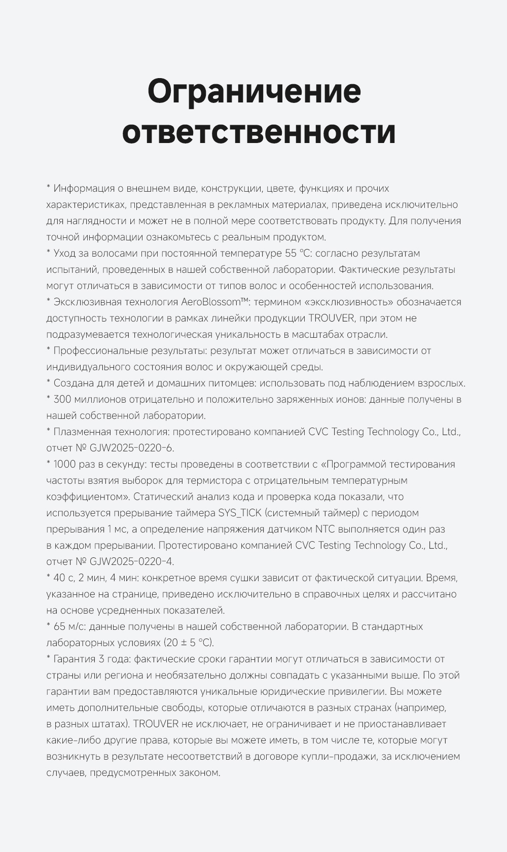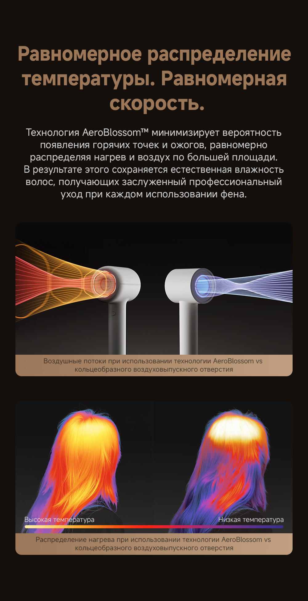 Автоматическая регулировка температуры в зависимости от расстояния. Поддерживает постоянную температуру 55°C для предотвращения перегрева кожи головы. AeroBlossom - инновационная конструкция распылителя разбивает крупные вихри на более мелкие, обеспечивая более плавный и равномерный поток воздуха. Равномерная скорость подачи воздуха.