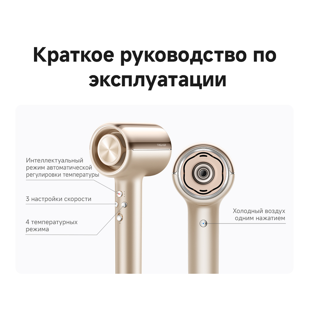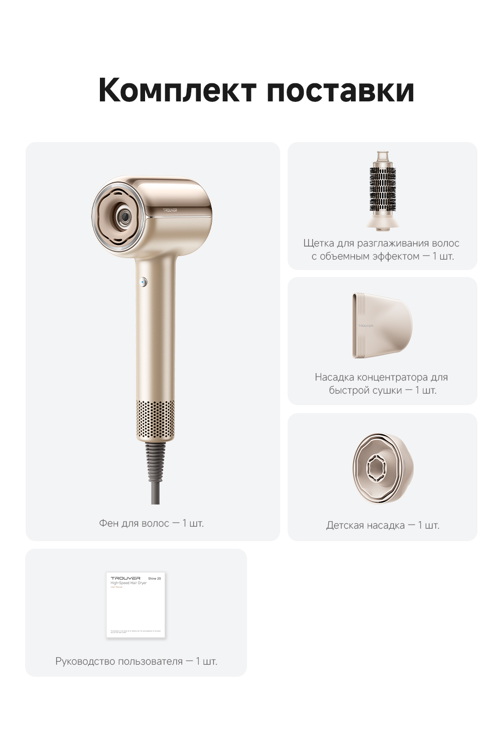 Фен для волос — 1 шт. Детская насадка — 1 шт. Насадка концентратора для быстрой сушки — 1 шт. Щетка для разглаживания волос с объемным эффектом — 1 шт. Руководство пользователя — 1 шт.