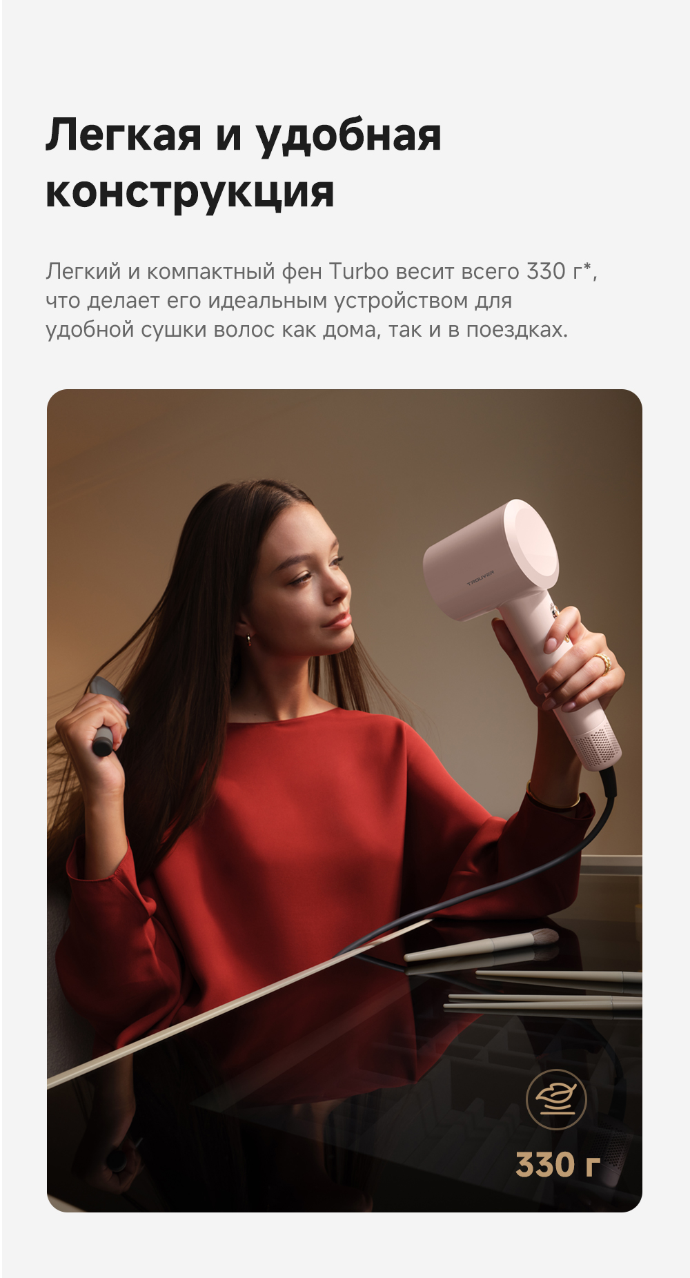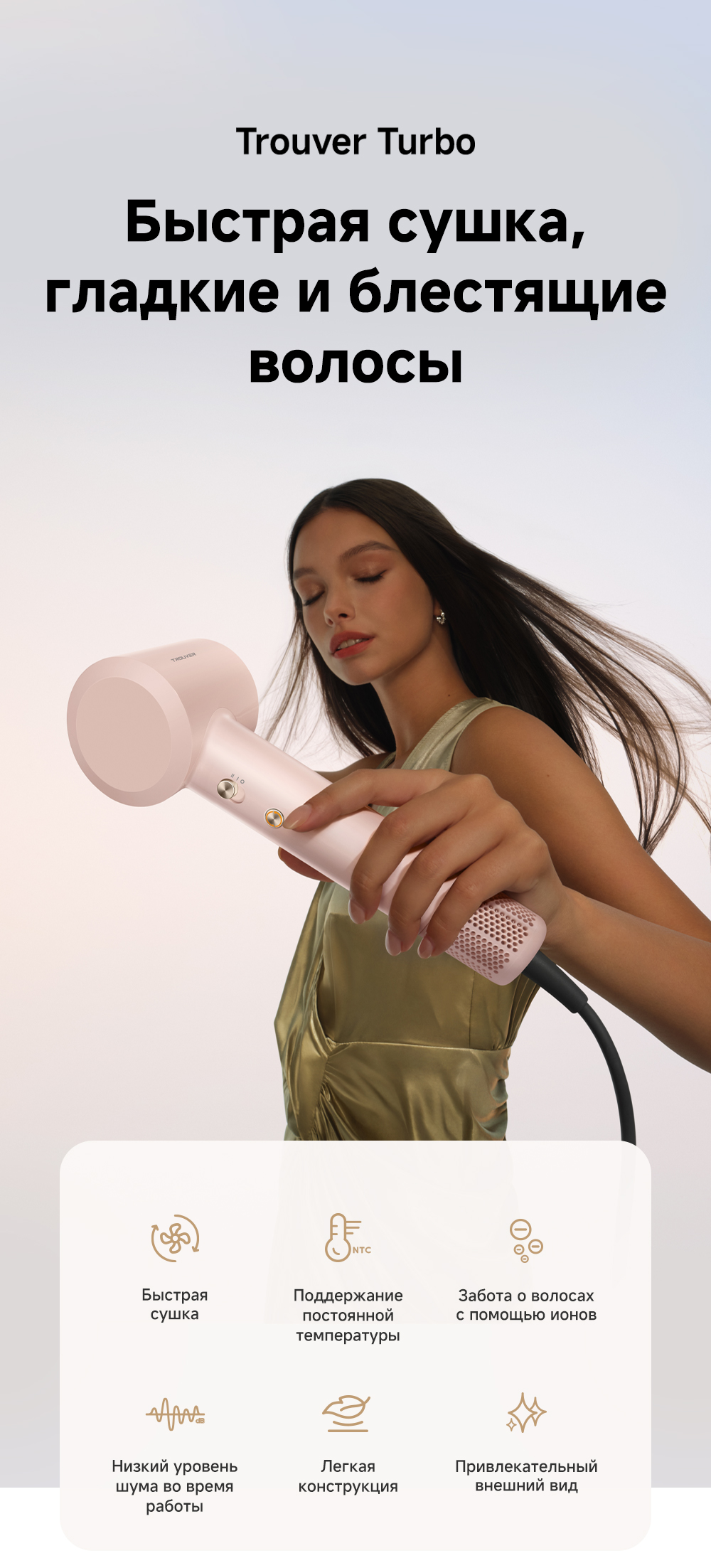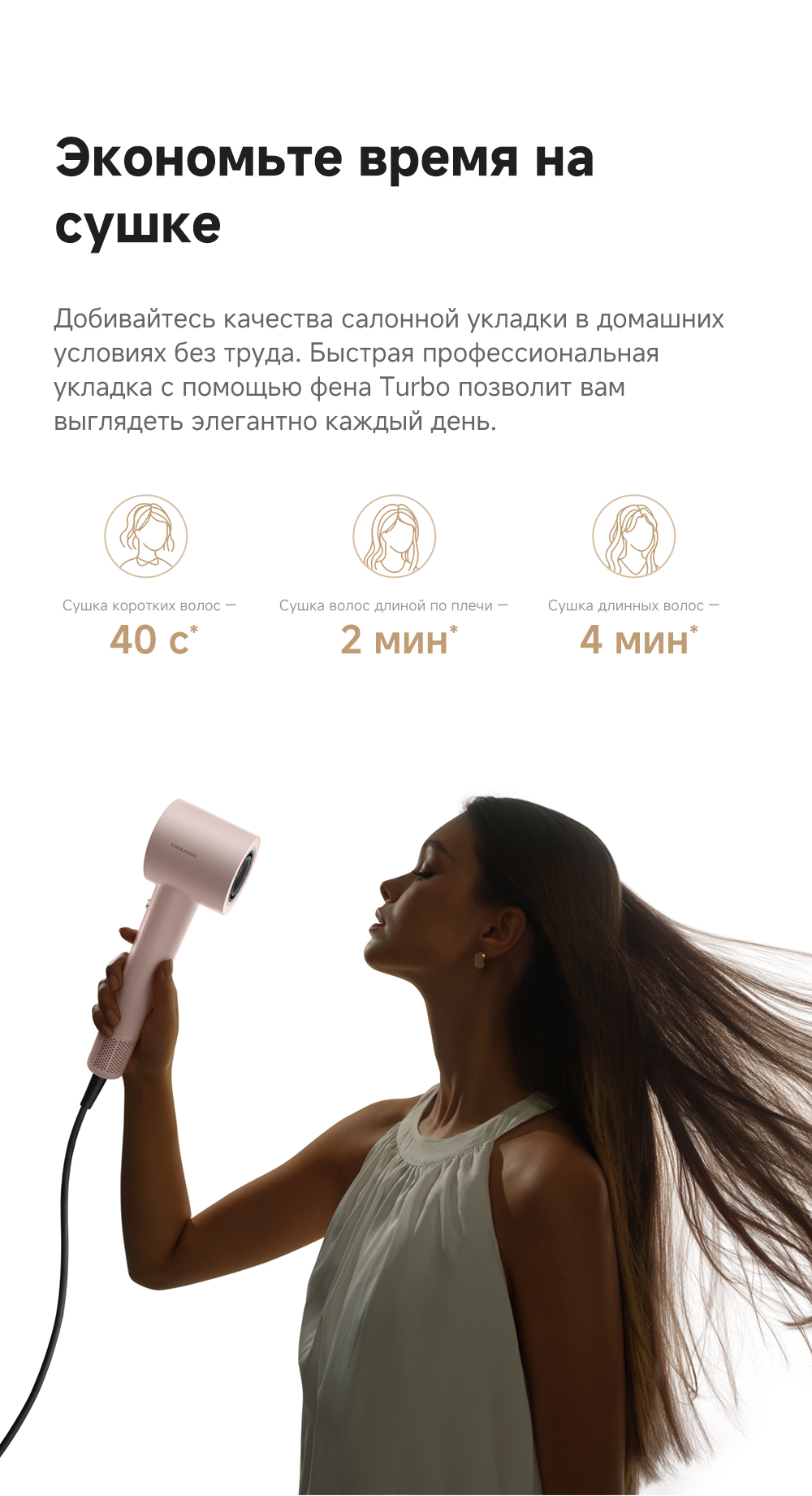 Высокоскоростной фен TROUVER Turbo обеспечивает эффективную и удобную сушку и уход за волосами, гарантируя, что они останутся блестящими в любое время и в любом месте.