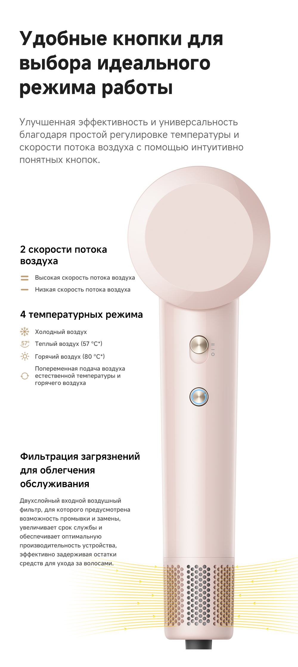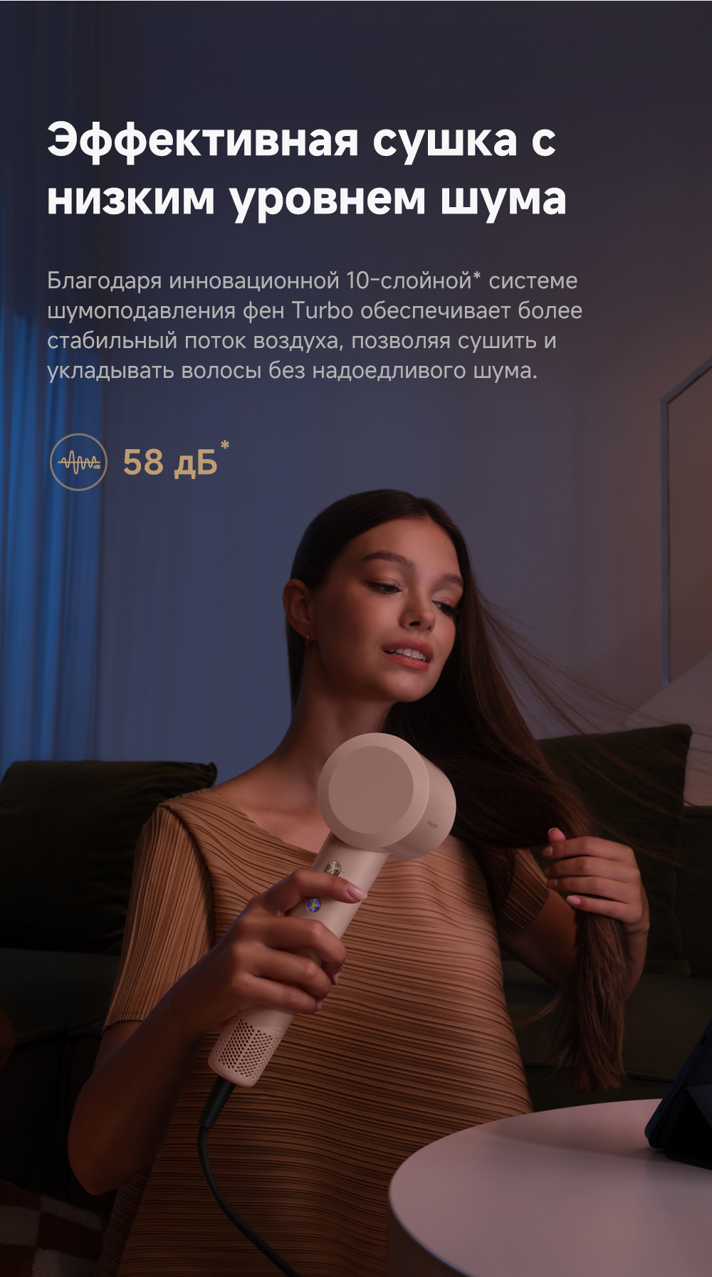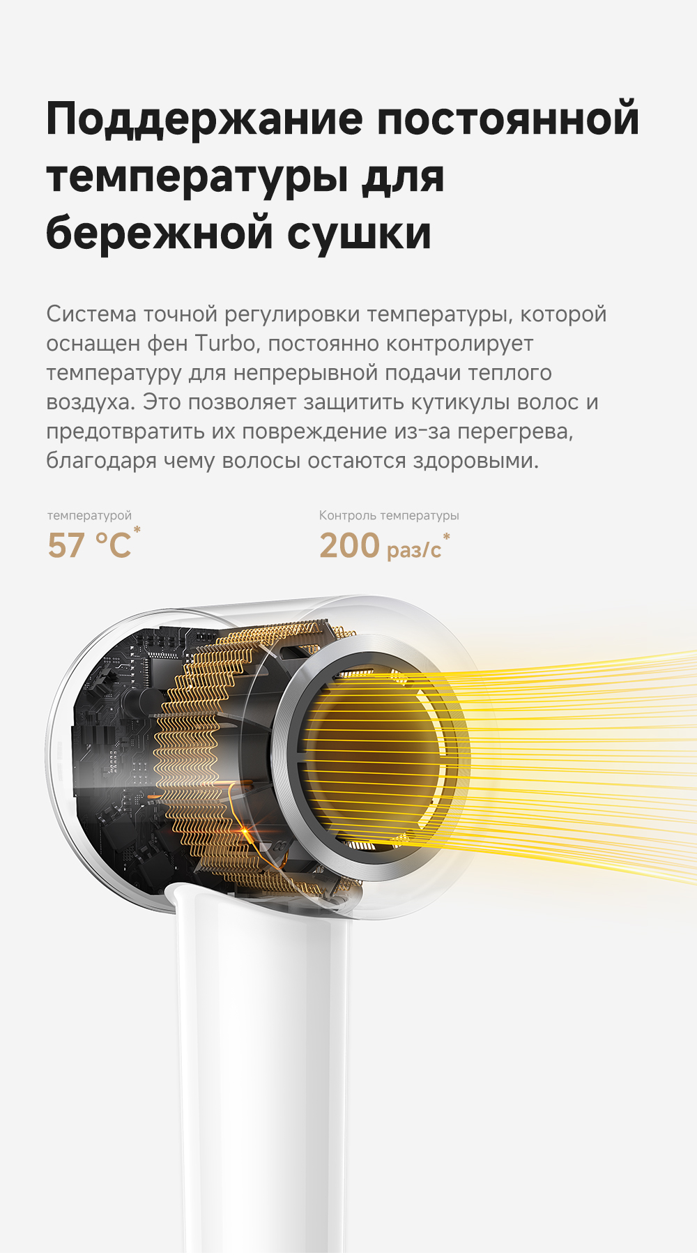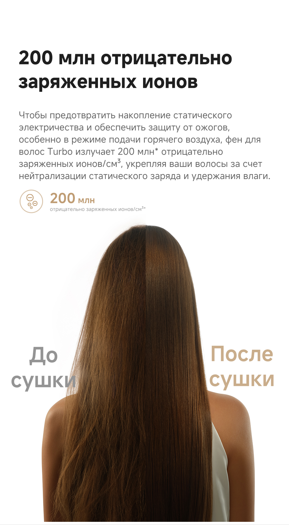 Бесщеточный двигатель с частотой вращения 110 000 об/мин. Усовершенствованный алгоритм измеряет температуру 200 раз в секунду, предотвращая перегрев и пересушивание волос. Выпускает 200 млн отрицательно заряженных ионов/см³, чтобы снять с волос статическое электричество, придать им гладкость и блеск. Компактный и легкий корпус, вес которого всего 330 грамм.