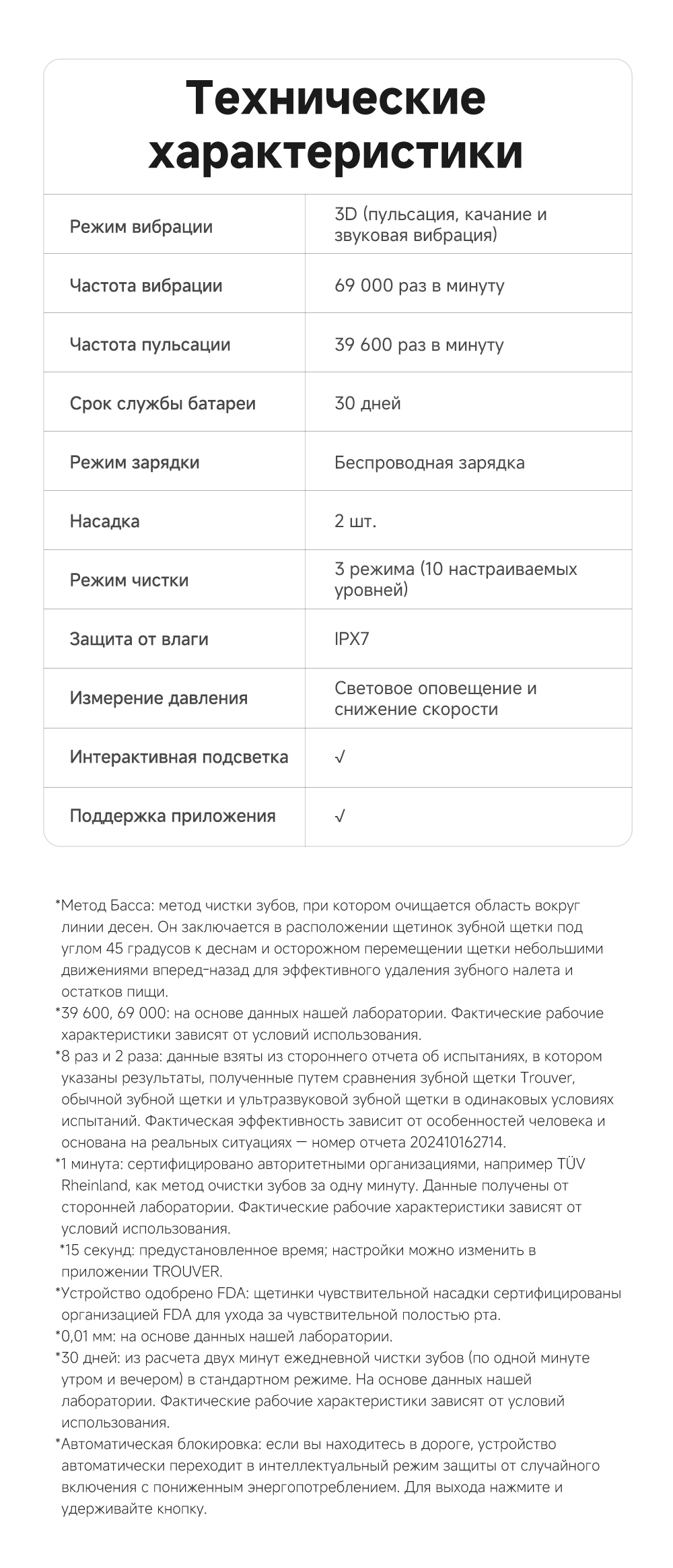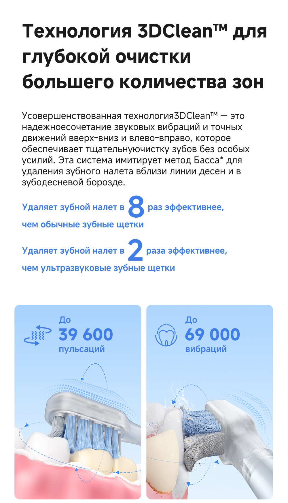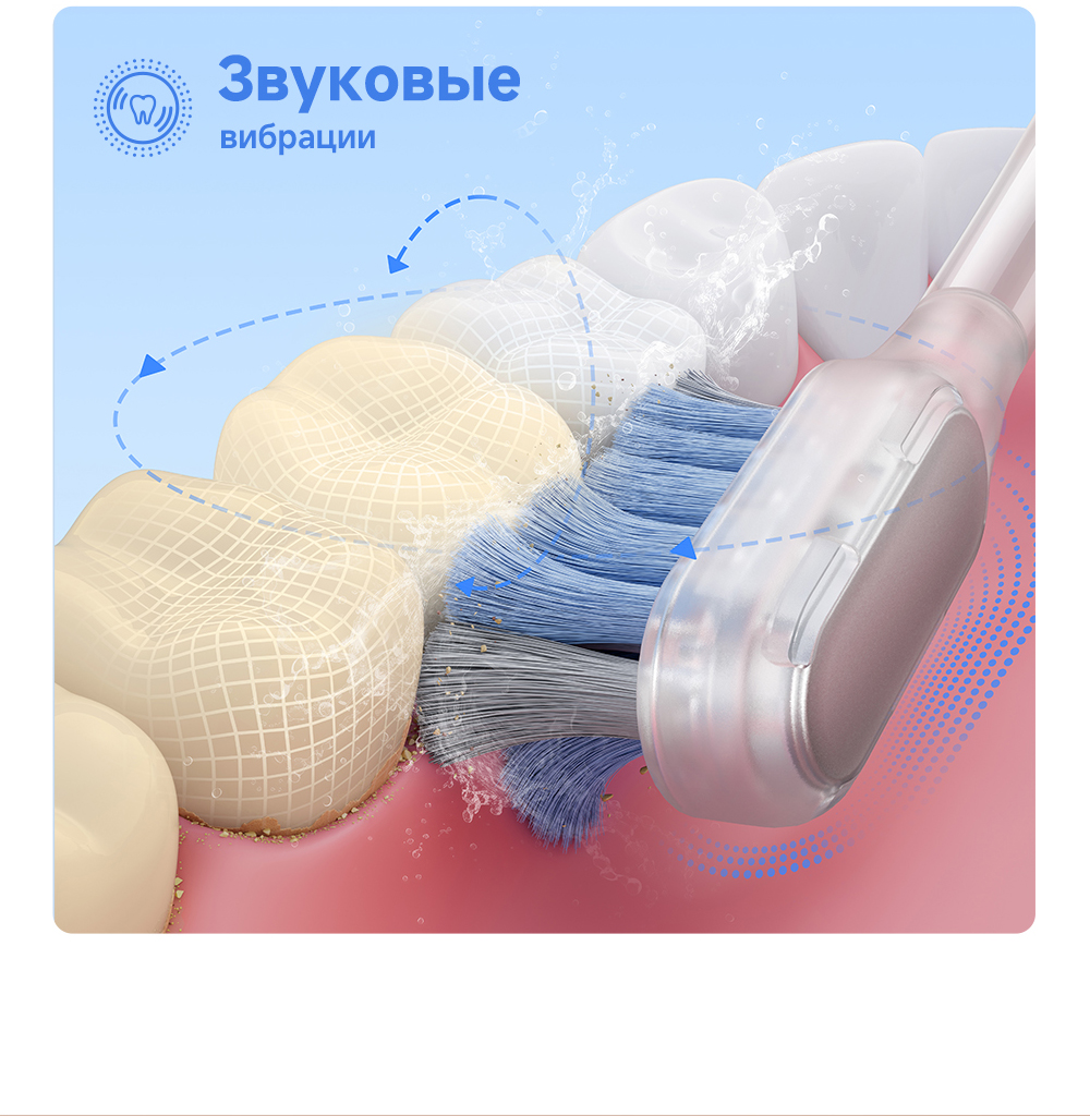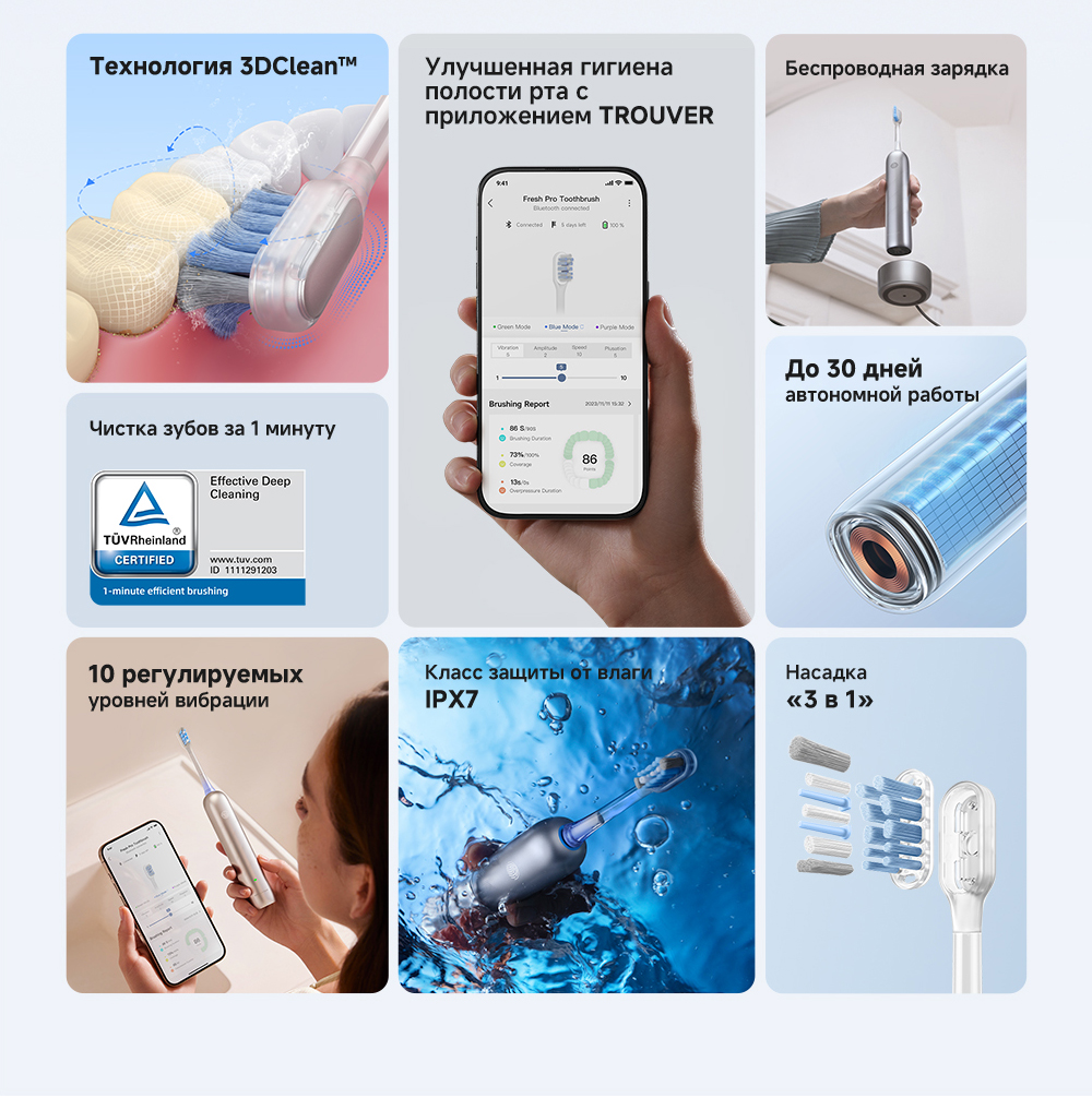 Технология 3DClean позволяет пропускать меньшее количество участков (благодаря пульсации, качанию и звуковой вибрации). Быстрое очищение за 1 минуту. Подключение через приложение. Режим защиты от случайного касания. 10 регулируемых уровней вибрации. Индивидуальный отчет о состоянии зубов. Частота вибраций 69 000. Беспроводная зарядка.