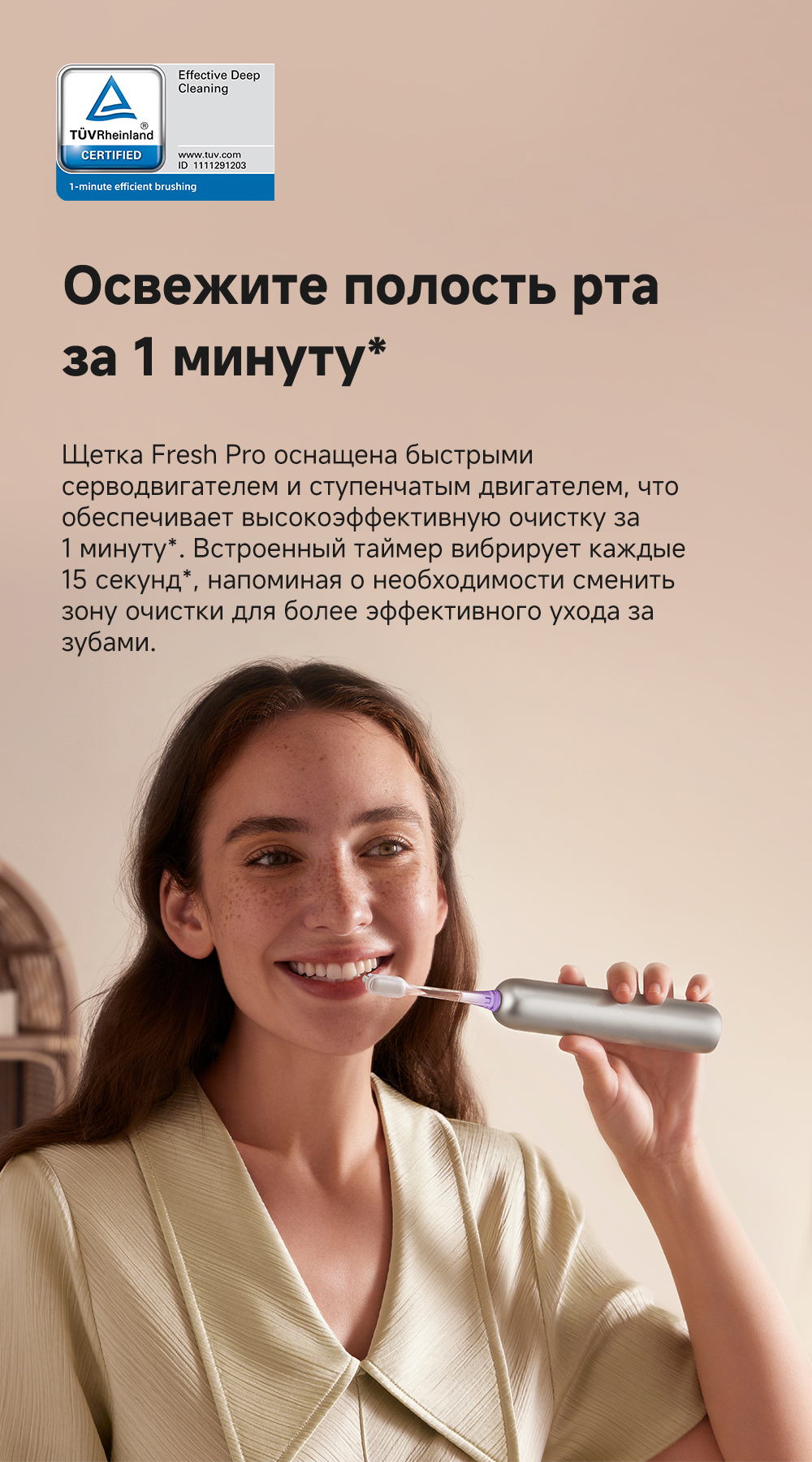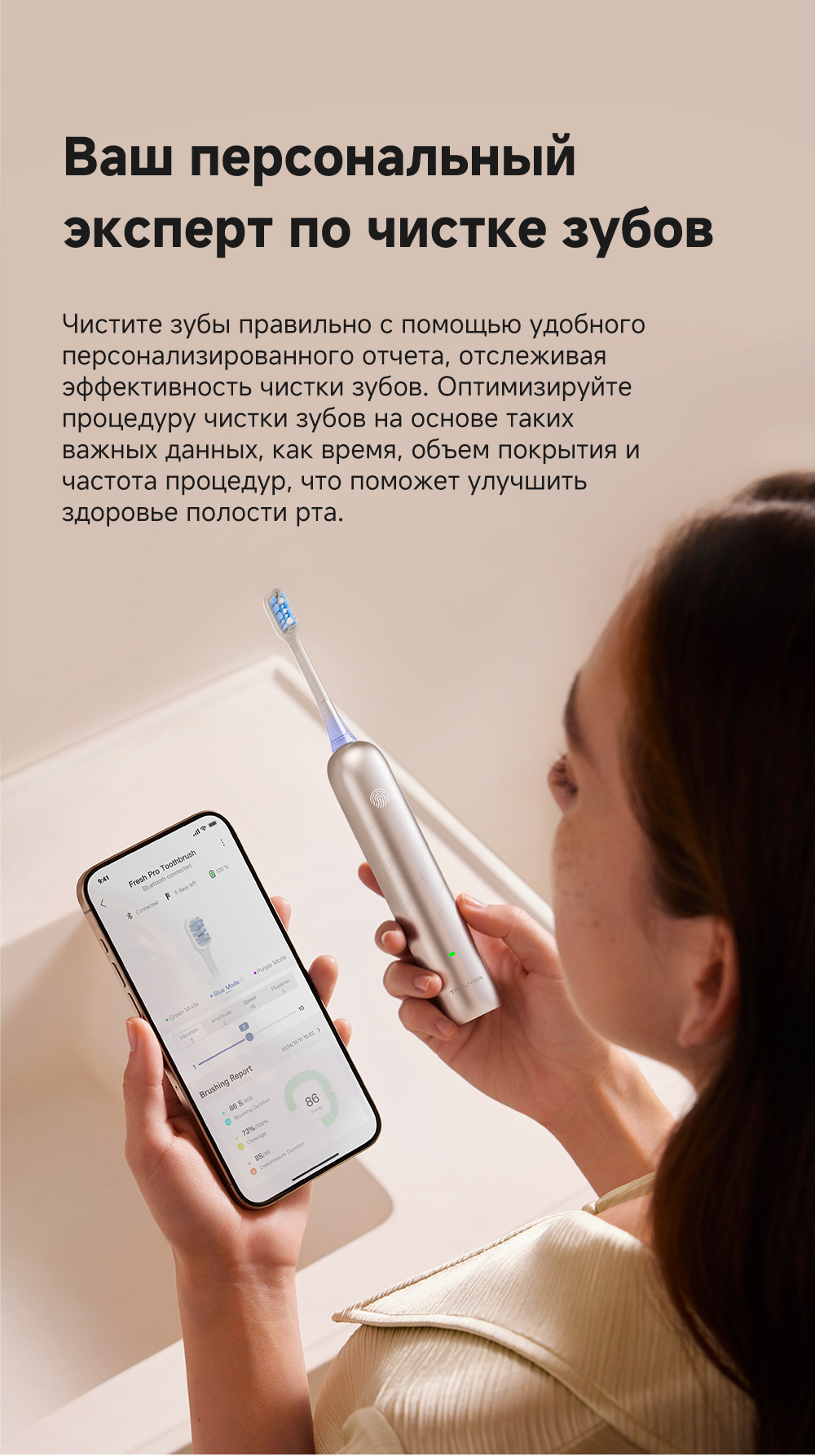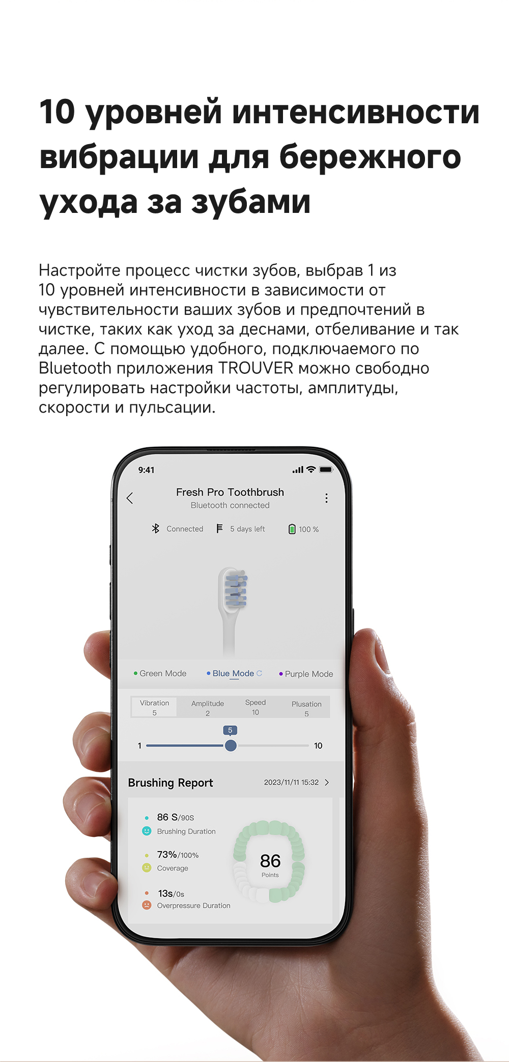 Технология 3DClean позволяет пропускать меньшее количество участков (благодаря пульсации, качанию и звуковой вибрации). Быстрое очищение за 1 минуту. Подключение через приложение. Режим защиты от случайного касания. 10 регулируемых уровней вибрации. Индивидуальный отчет о состоянии зубов. Частота вибраций 69 000. Беспроводная зарядка.