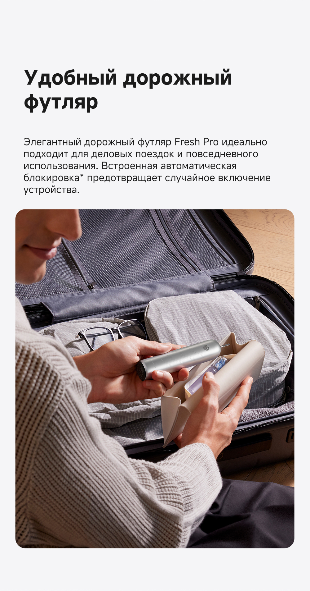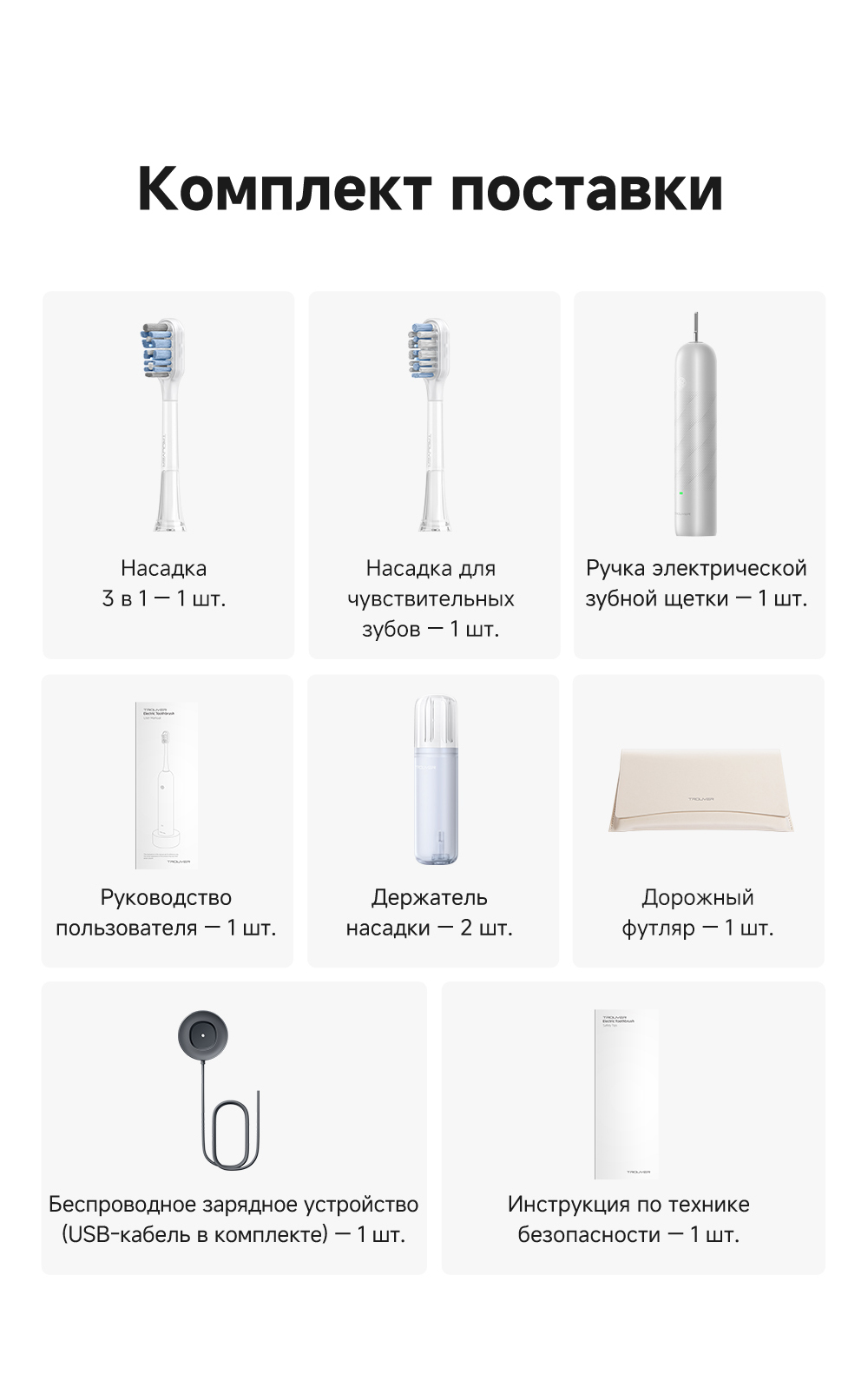Ручка электрической зубной щетки, насадка - 2 шт., беспроводное зарядное устройство, держатель насадки - 2 шт., дорожный футляр, руководство пользователя.