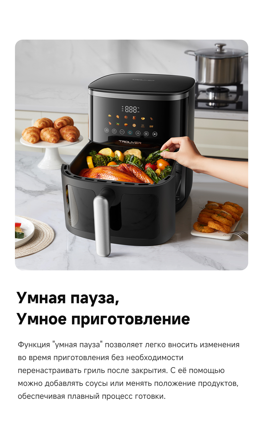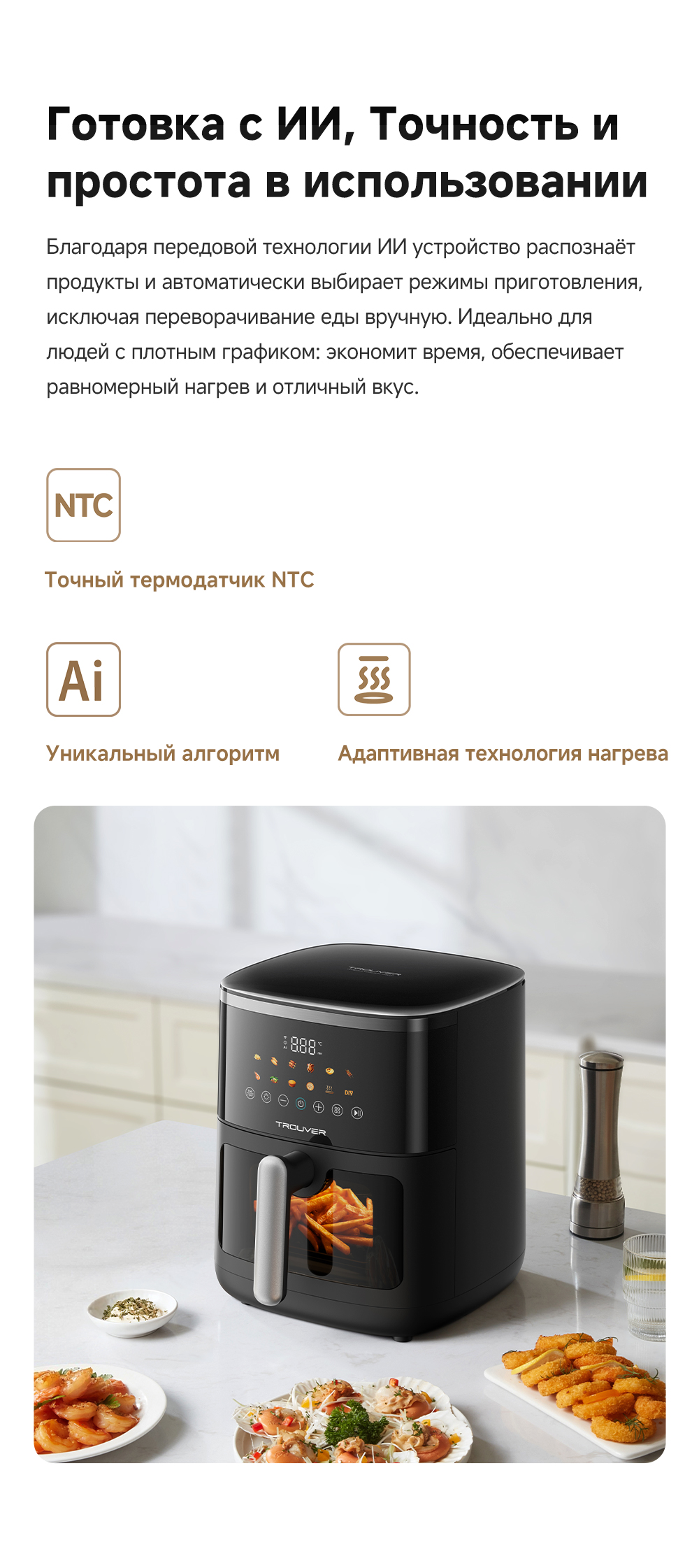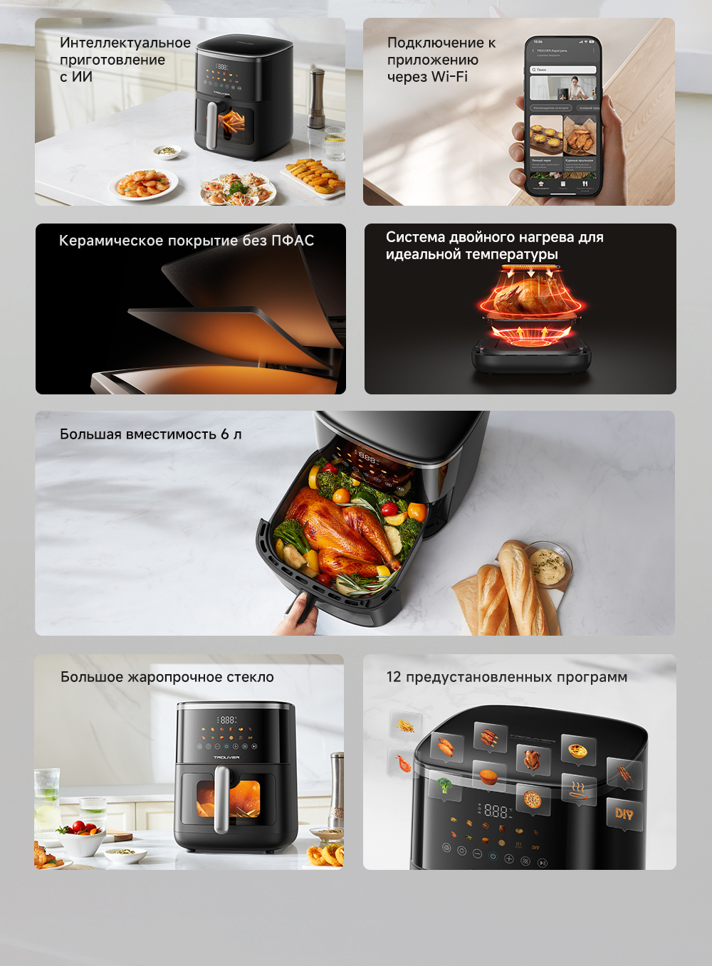 ОписаниеУмное приготовление с ИИ. Подключение к приложению. Безопасное керамическое покрытие чаши. Система двойного нагрева с циркуляцией горячего воздуха на 360°.ОсобенностиПодключение к Wi-Fi. Большое смотровое жаропрочное стекло. 12 предустановленных программ. Точный термодатчик NTC, адаптивная технология нагрева.