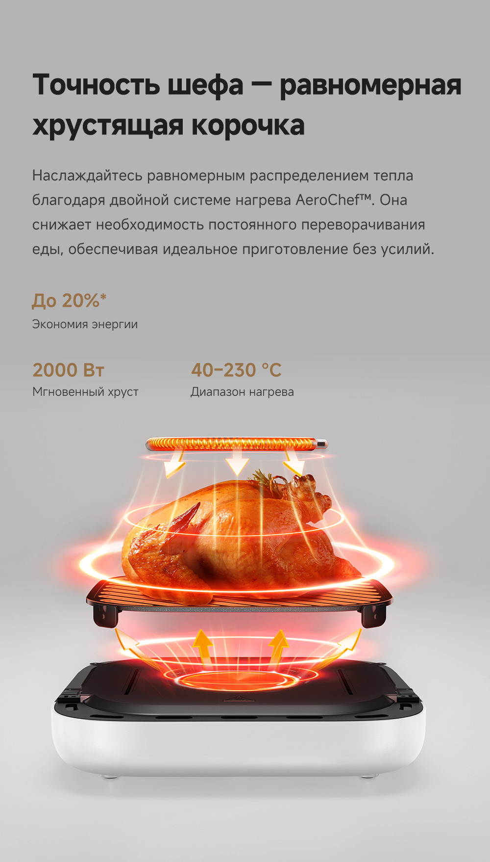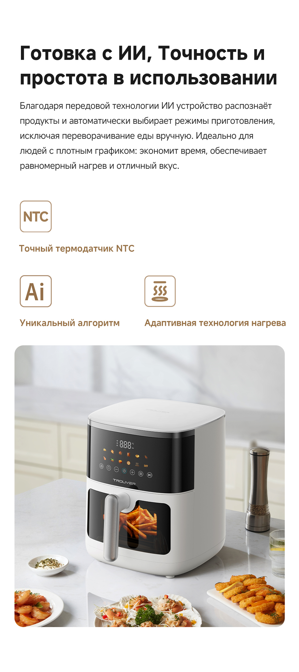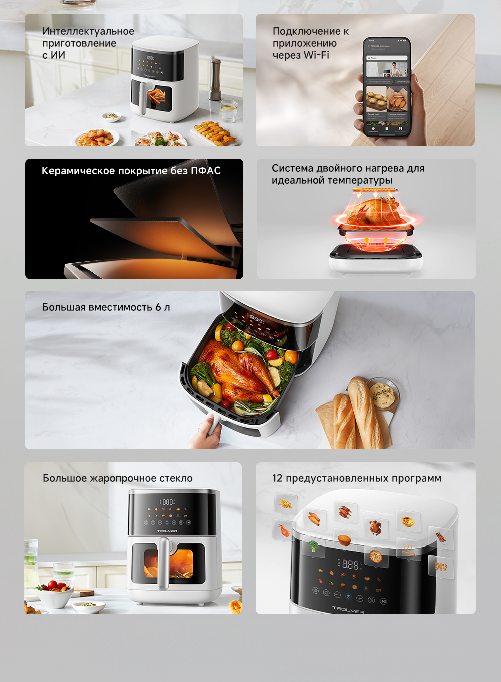 ОписаниеУмное приготовление с ИИ. Подключение к приложению. Безопасное керамическое покрытие чаши. Система двойного нагрева с циркуляцией горячего воздуха на 360°.ОсобенностиПодключение к Wi-Fi. Большое смотровое жаропрочное стекло. 12 предустановленных программ. Точный термодатчик NTC, адаптивная технология нагрева.
