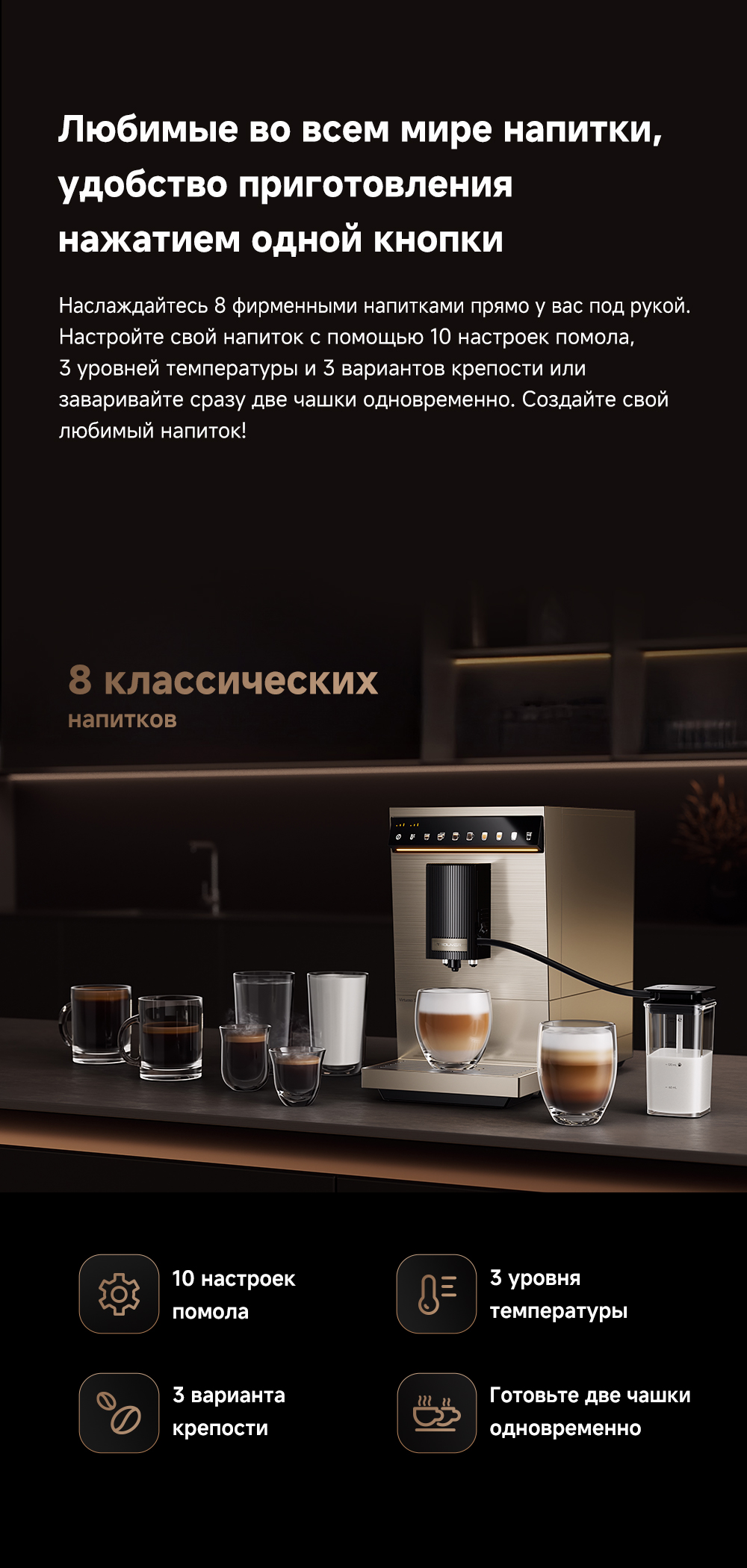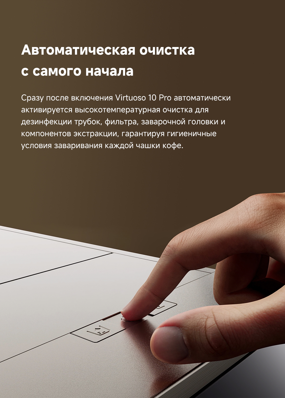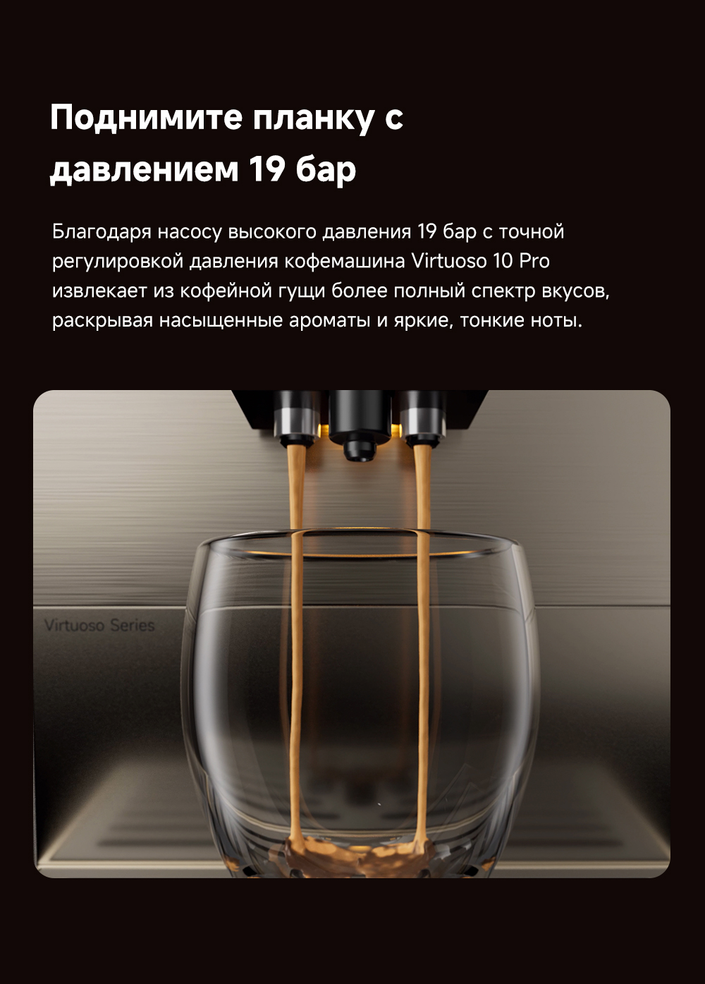 АртикулVirtuoso 10 ProМодельVirtuoso 10 Pro GoldОписаниеЭкстракция под высоким давлением 19 БАР. Точный контроль приготовления: температура экстракции, время экстракции и объем воды для экстракции. Автоматическая промывка горячей водой при запуске и выключении. Эстетичный стиль минимализма.ОсобенностиСветодиодный цветной сенсорный интерфейс. Система вспенивания молока LatteArtisan - приготовление кофе с молоком всего одним нажатием. Индивидуальные напитки: 8 вариантов меню, 3 уровня регулировки температуры, 3 уровня выбора крепости, 10 уровней настройки помола, приготовление 2 чашек за раз.ТипкофемашинаНазначениеприготовление напитковСвязанные элементы по цветуГалереяМощность (Вт)1470Входное напряжение (макс, B)220Бак для чистой воды (л)1.5СерияVirtuoso - серияТип управленияcенсорноеЦветзолотистыйИндикация включениядаТип электропитанияот сетиКоличество программ/режимов8Установка температуры приготовлениядаИнформационный дисплейдаЗвуковой сигналдаАвтоматическое отключение (защитное)даИндикатор включениядаМинимальная цена со скидкой1599Краткое наименованиеVirtuoso 10 ProРазмеры18.8х43.7х31.5 смВес8.05ИзготовительMoonstone Technology (Shaoxing) Co., Ltd. Офис 301, 3/F, блок 2, Чуансин Роуд, 99, район Юэчээн, округ Шаосин, провинция Чжэцзян, КНРИмпортерООО "АйТи Дистрибуция" 223053. РБ, Минская область, Минский р-н, Боровлянский с/с, д.103/3-77, помещение 7-50, район д. ДроздовоСрок гарантии36 мес.