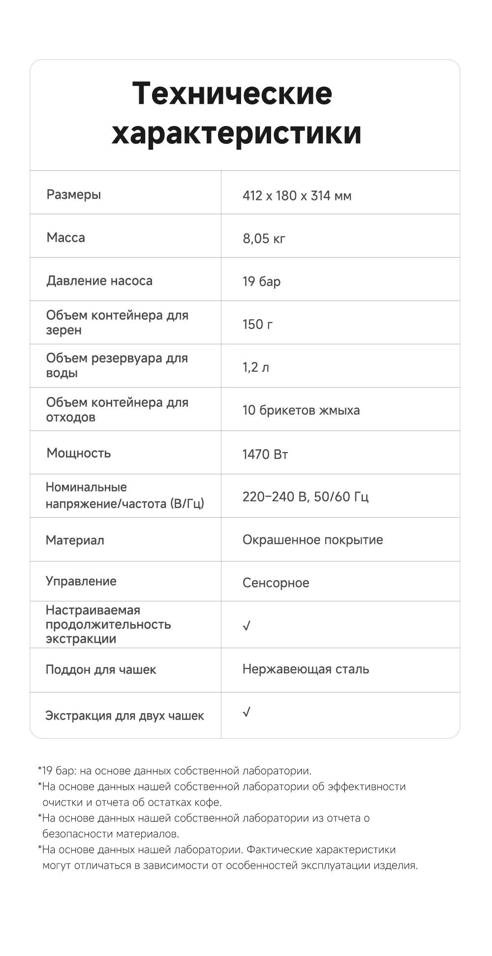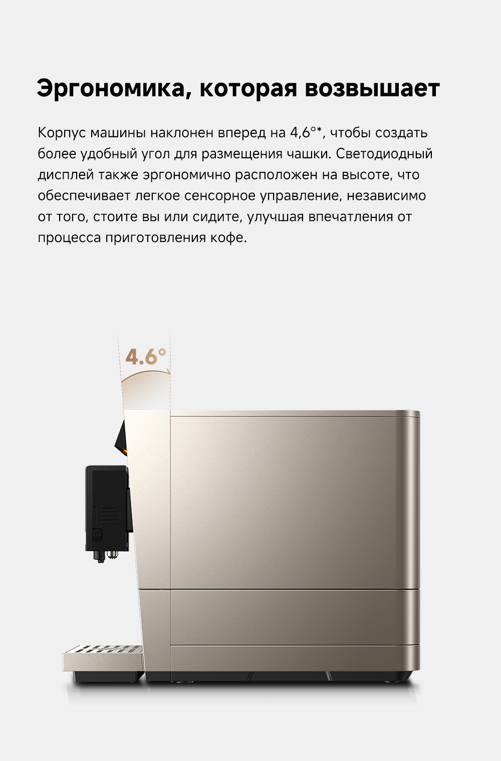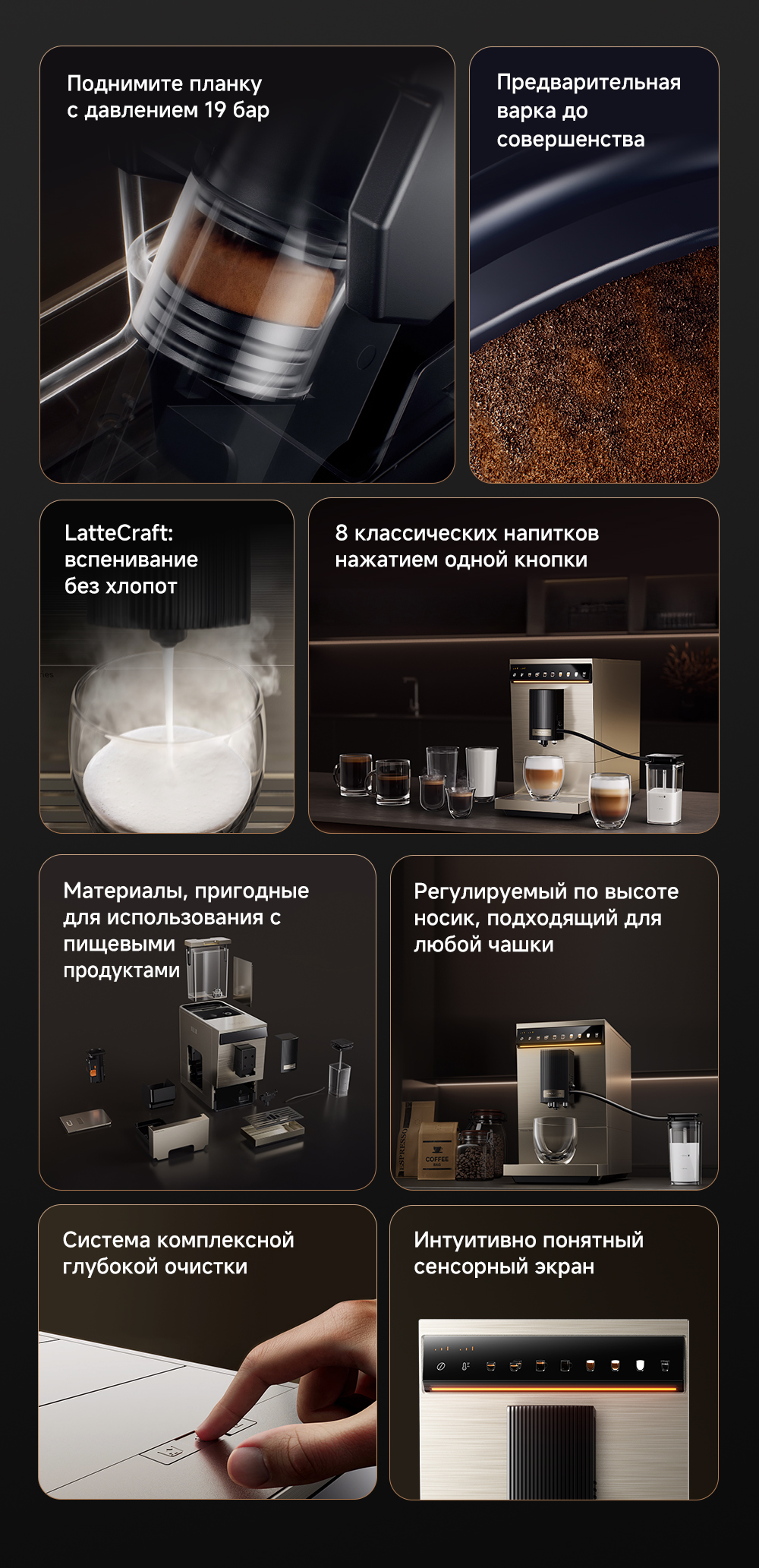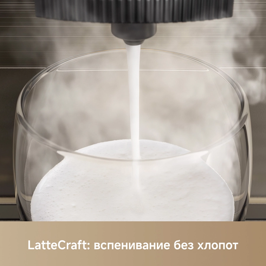 ОписаниеЭкстракция под высоким давлением 19 БАР. Точный контроль приготовления: температура экстракции, время экстракции и объем воды для экстракции. Автоматическая промывка горячей водой при запуске и выключении. Эстетичный стиль минимализма.ОсобенностиСветодиодный цветной сенсорный интерфейс. Система вспенивания молока LatteArtisan - приготовление кофе с молоком всего одним нажатием. Индивидуальные напитки: 8 вариантов меню, 3 уровня регулировки температуры, 3 уровня выбора крепости, 10 уровней настройки помола, приготовление 2 чашек за раз.