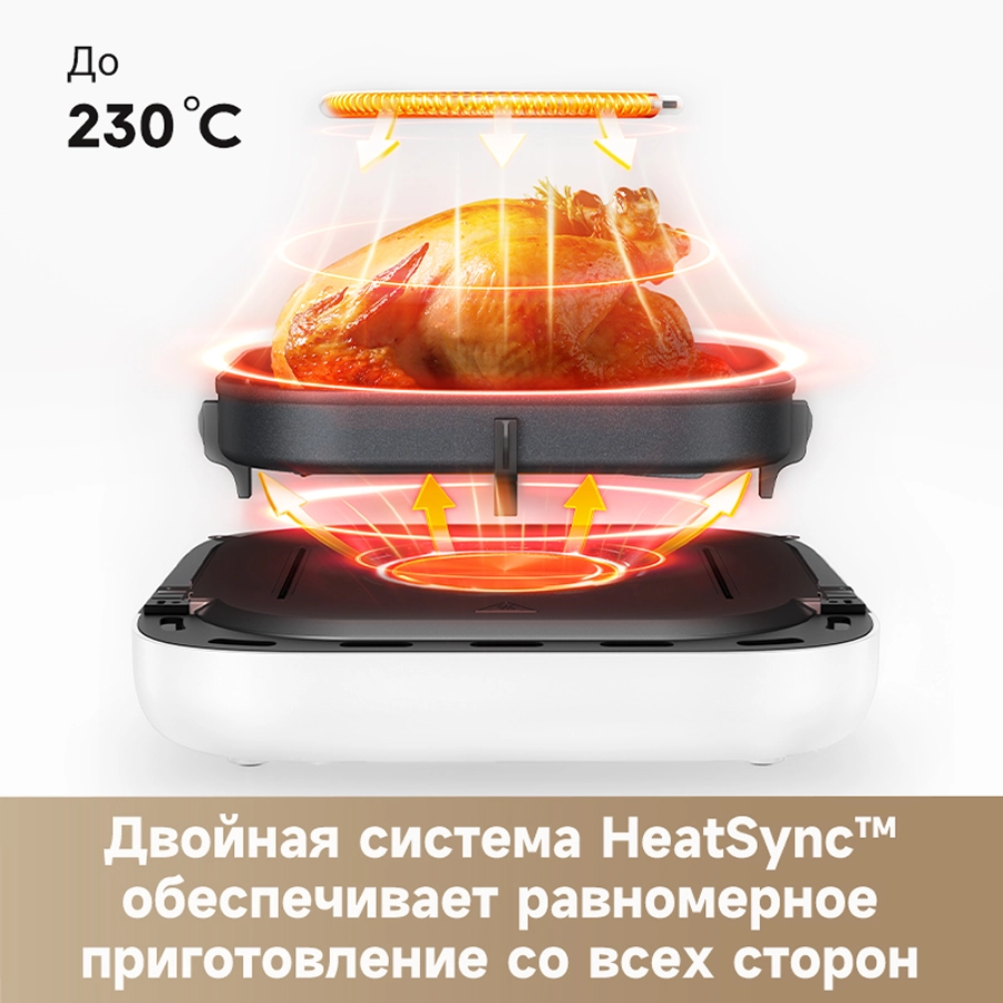 ОписаниеТехнология циркуляции горячего воздуха Poly-Air на 360°. 11 программ приготовления. Визуальный контроль приготовления. Двойная система нагрева: сверху и снизу.ОсобенностиДвойная система HeatSync нагревает сверху вниз. Температура нагрева от 50 до 230 °C. Металлическая внутренняя поверхность. Ёмкость чаши 6 литров. Рифленая сковорода-гриль. Четырехзонное распределение тепла.